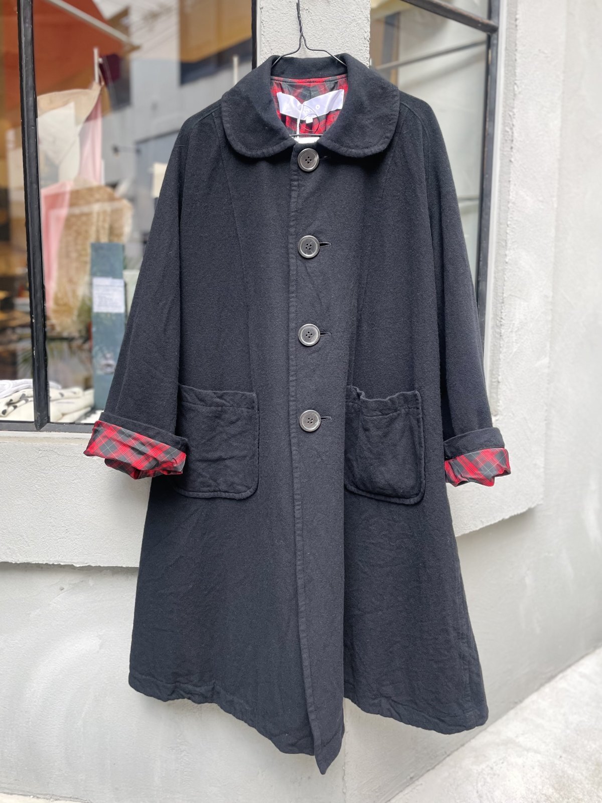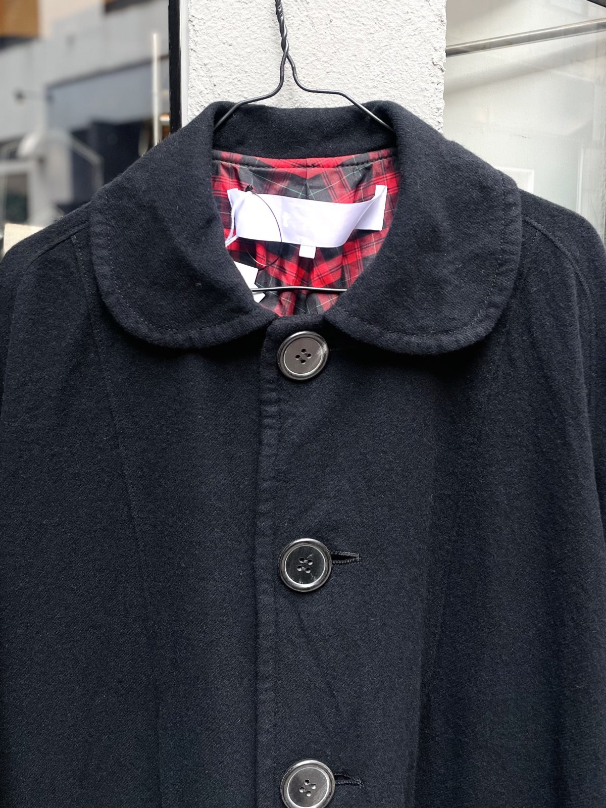 ウール縮絨の丸襟コート。軽い着心地なのに風を通さず暖かい。裏地のタータンチェックがとてもかわいい。袖をひと折りしてちらっと見せても。