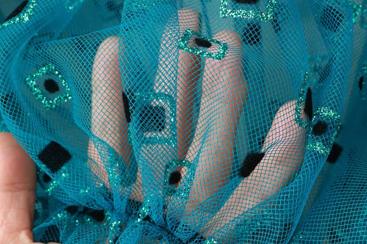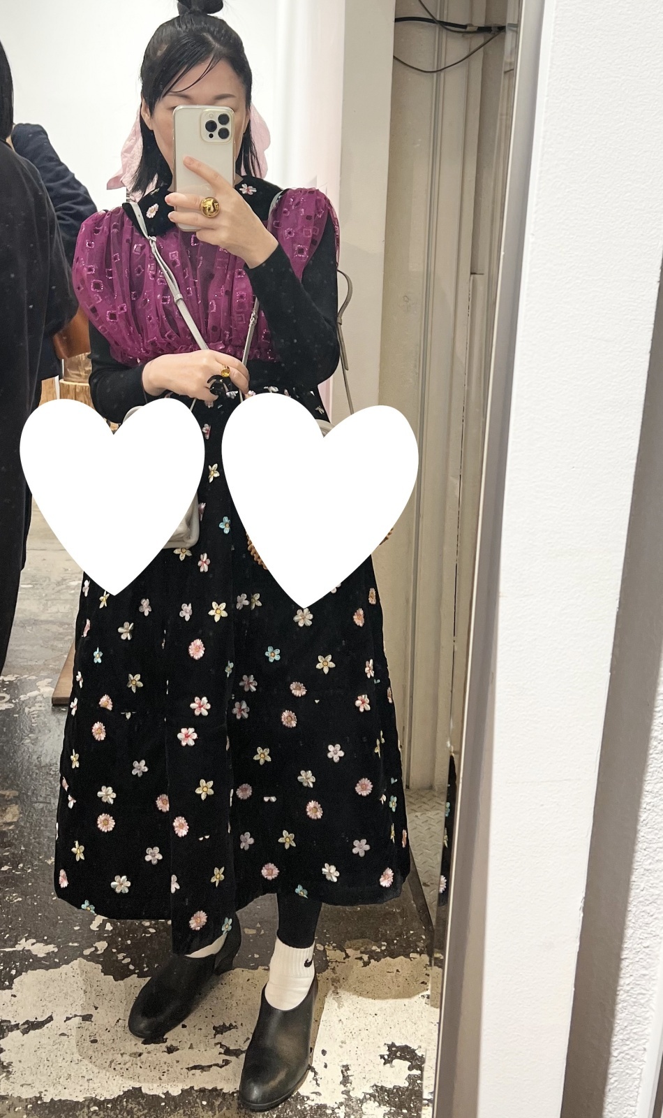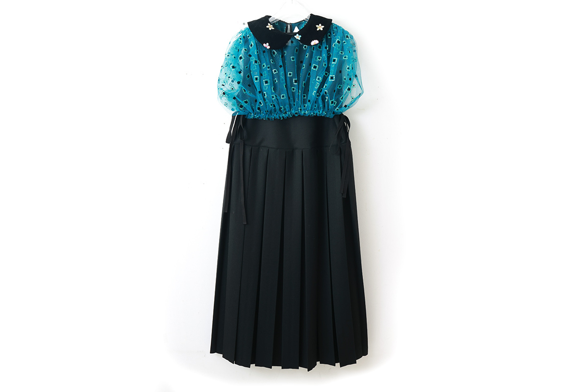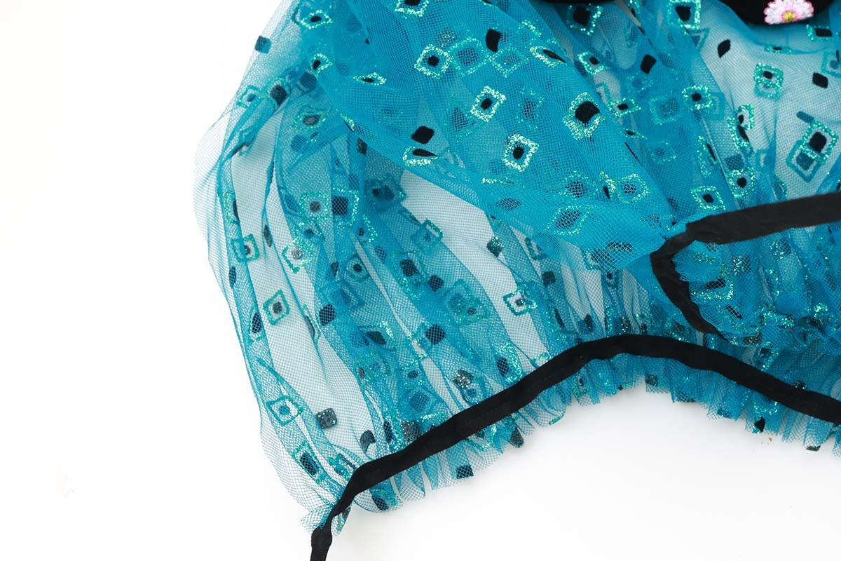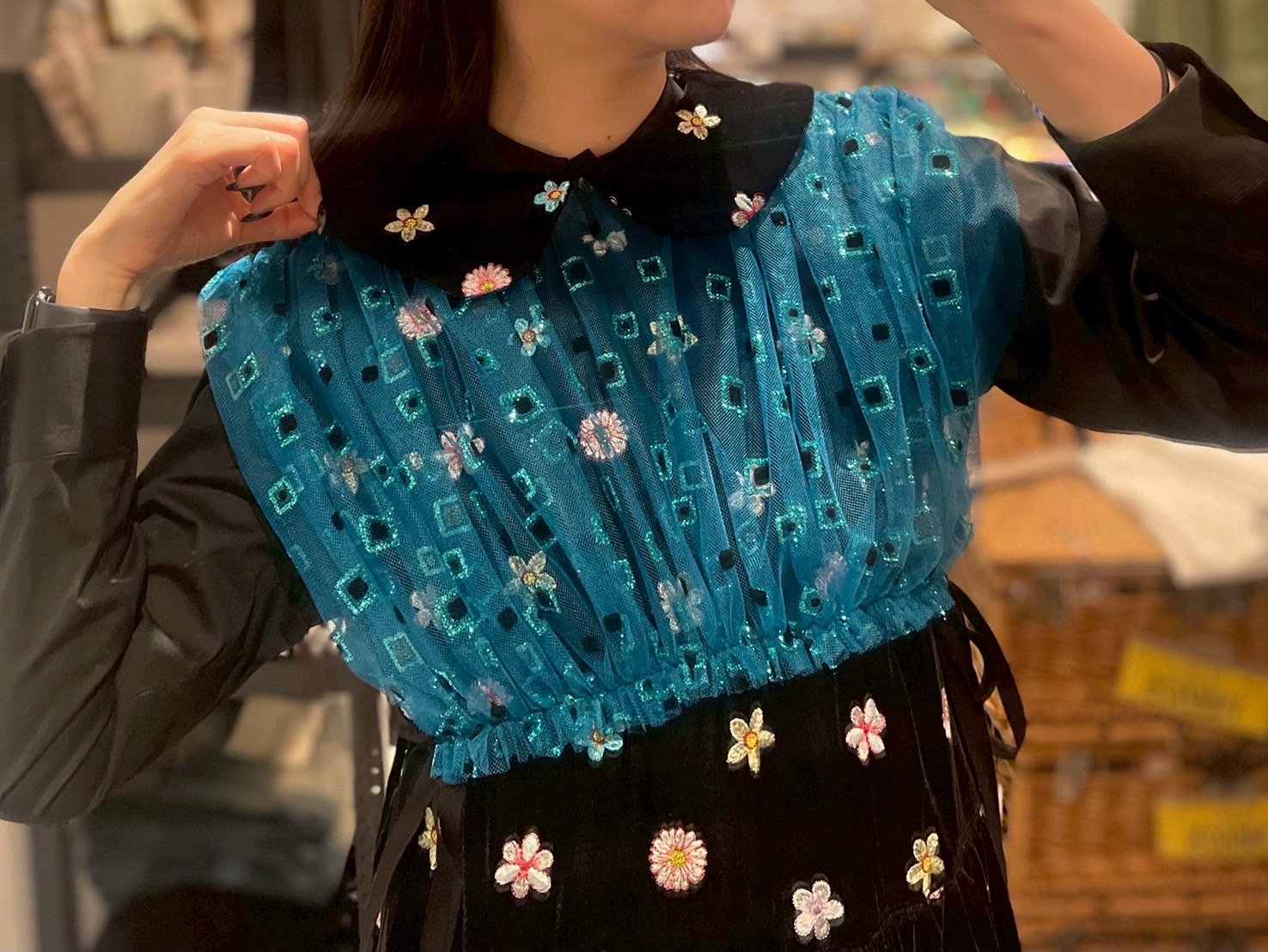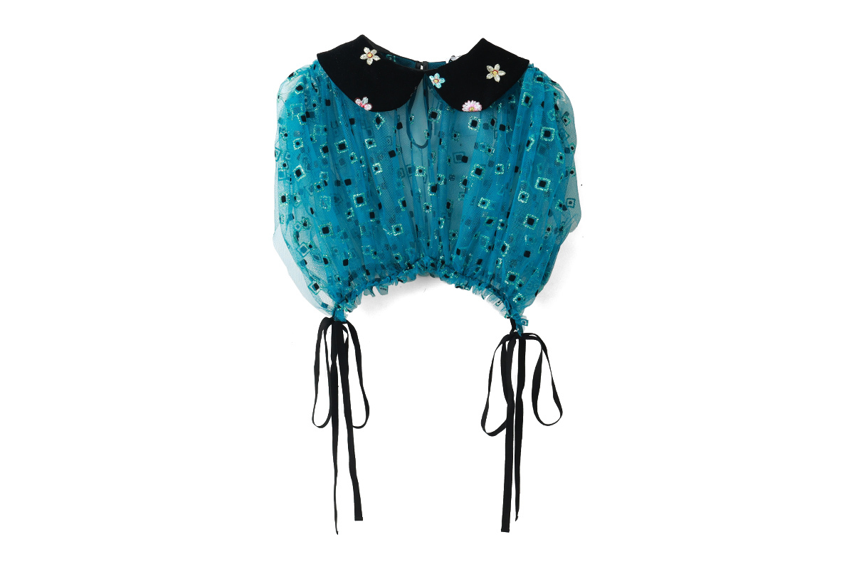 チュールとベロア素材の組み合わせが個性的なトップスです。フロッキーとラメがあしらわれたチュール部分にベルベットの襟には色とりどりの花の刺繍が施されています。華やかなアイテムなのでシンプルなワンピースやトップスに重ねるだけでコーディネートが完成します。