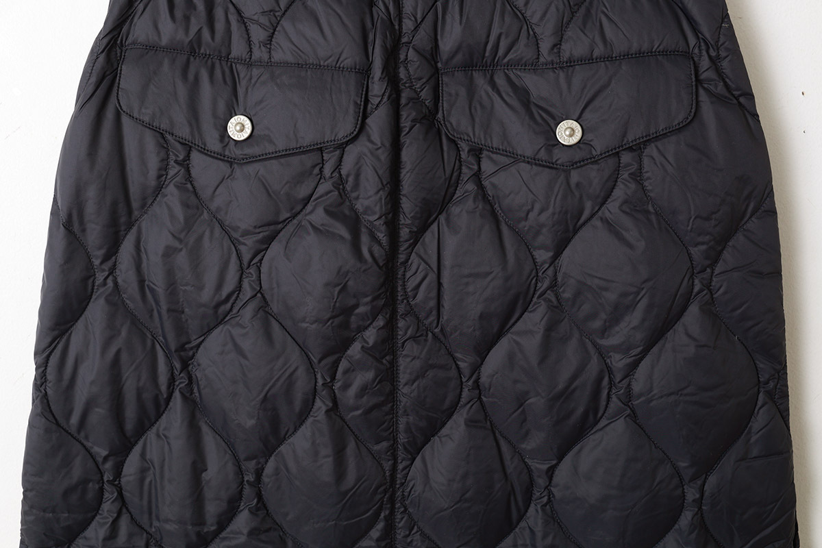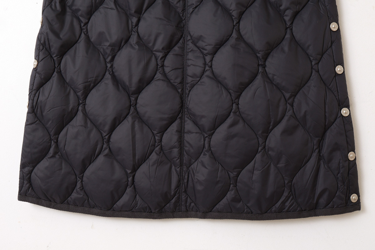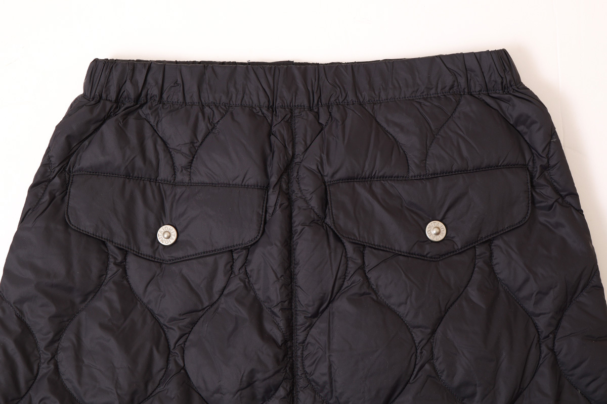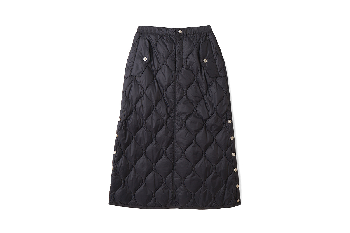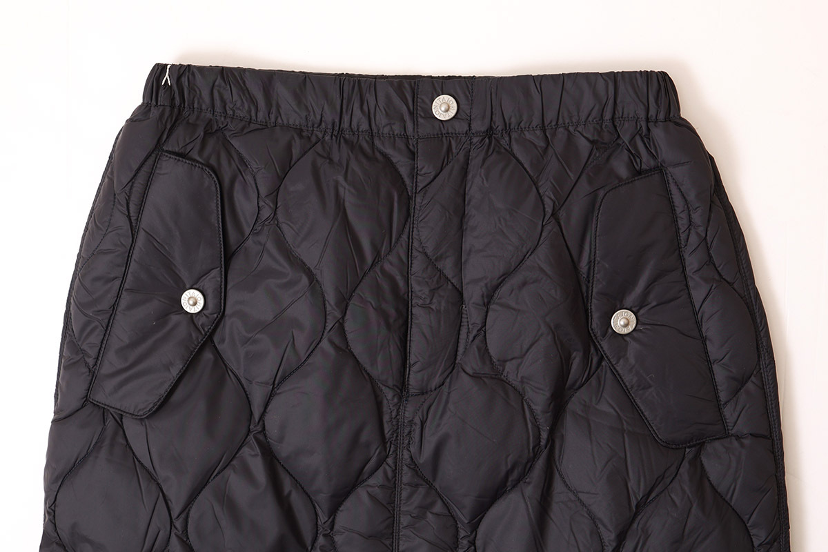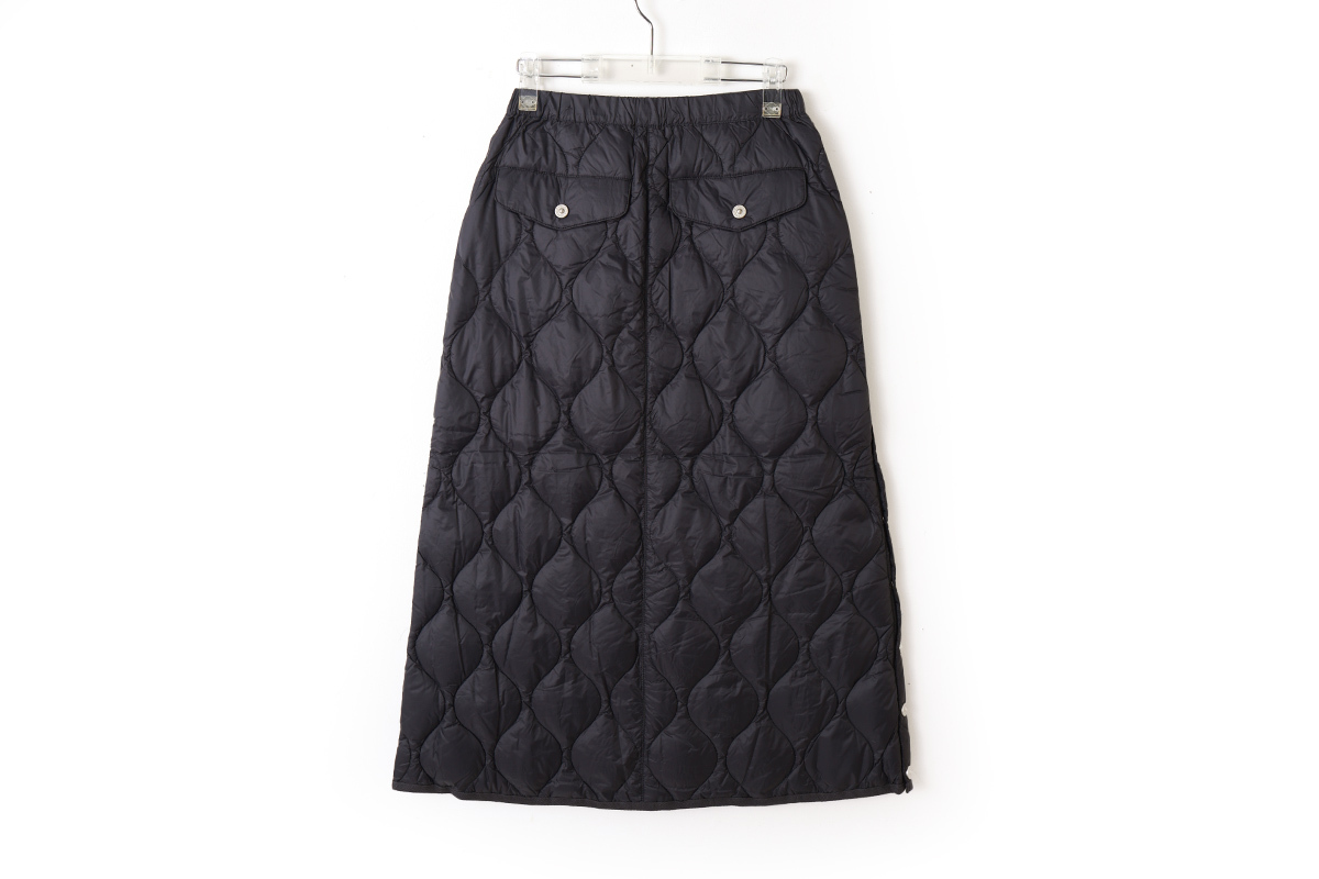 金属ボタンのスリットがアクセント、履き心地を重視したミリタリーダウンロングスカート。心地いいボリューム感は、冬のアウターとの相性も抜群です。軽くて柔らかな生地は保温性もさることながら履き心地抜群です。ひざ上まで開閉できるサイドスリットにより、ロングスカートでも足さばきを容易にしています。スパッツやパンツとの重ね着もおすすめな、暖かく履き応えのある、ミリタリーテイストのダウンスカートです。同シリーズ(MILITARY LINE)のダウンウェアやダウンマフラーなどと合わせていただくこともお勧めします。