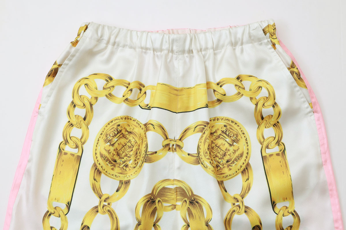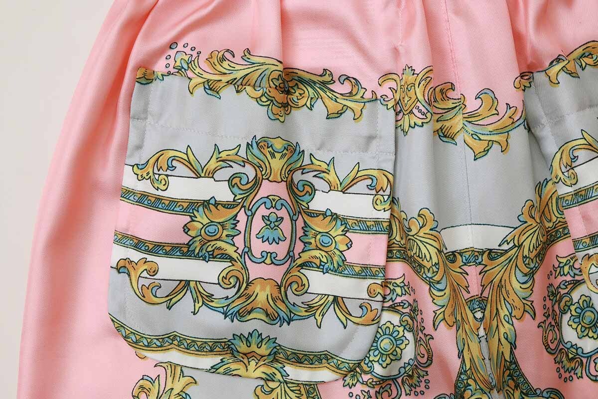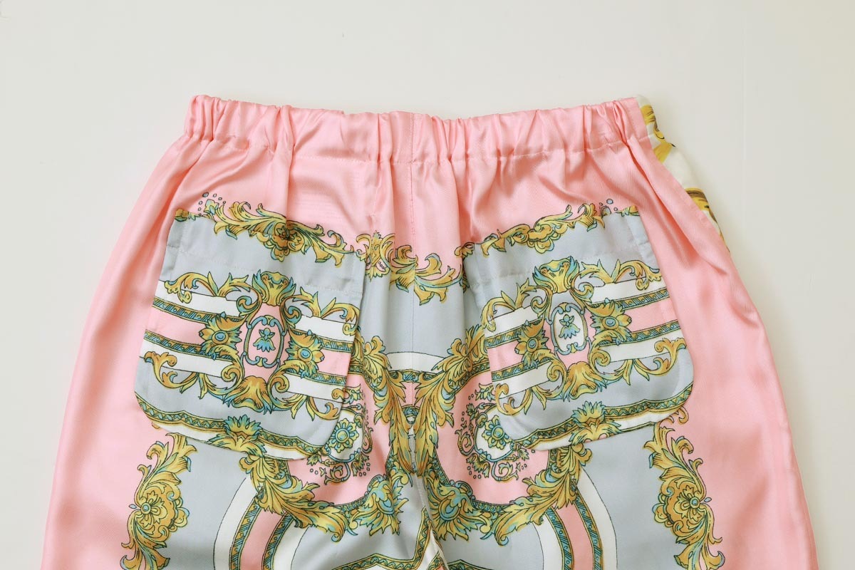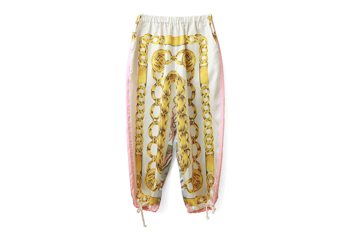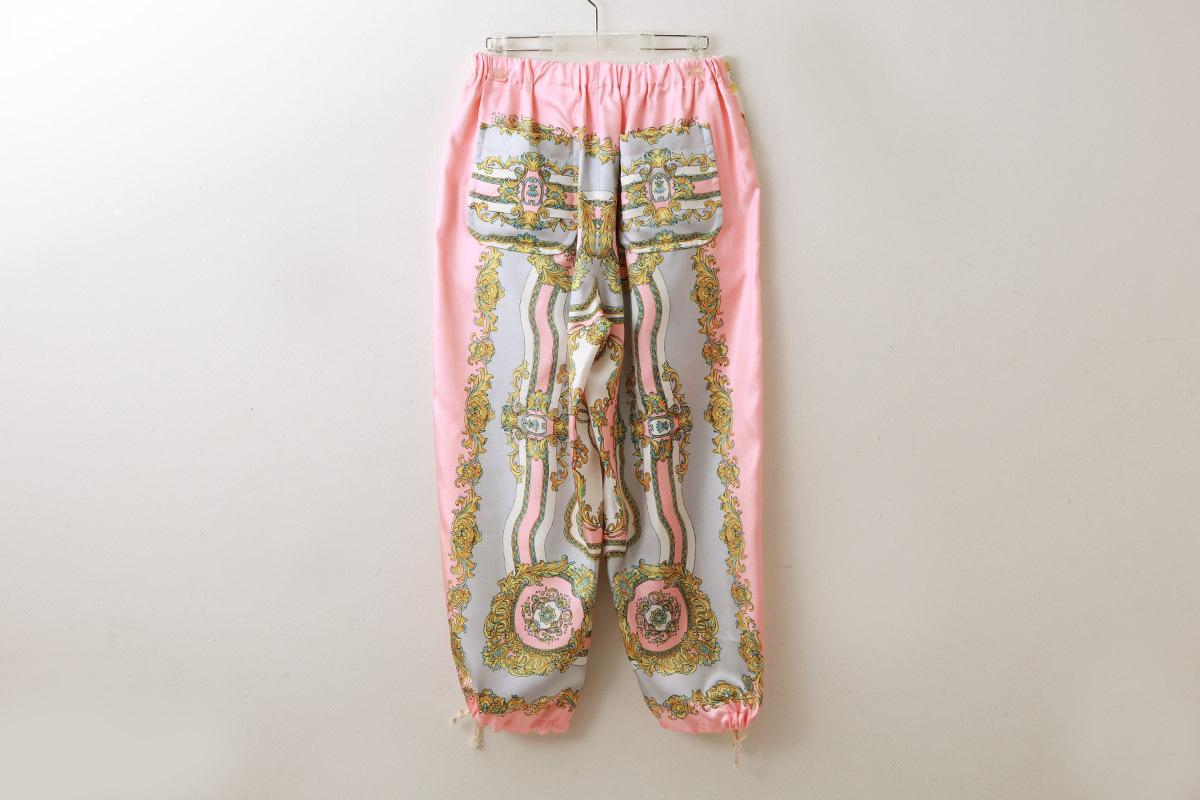ゴージャスなスカーフ柄がプリントされたパンツ。裾の紐を解いてストンとシンプルにも裾を絞ってバルーンパンツのようにも履くことができます。コーディネートの主役になるパンツです。