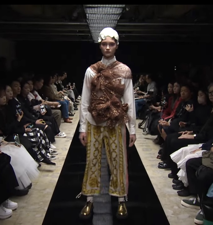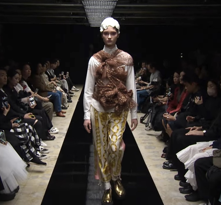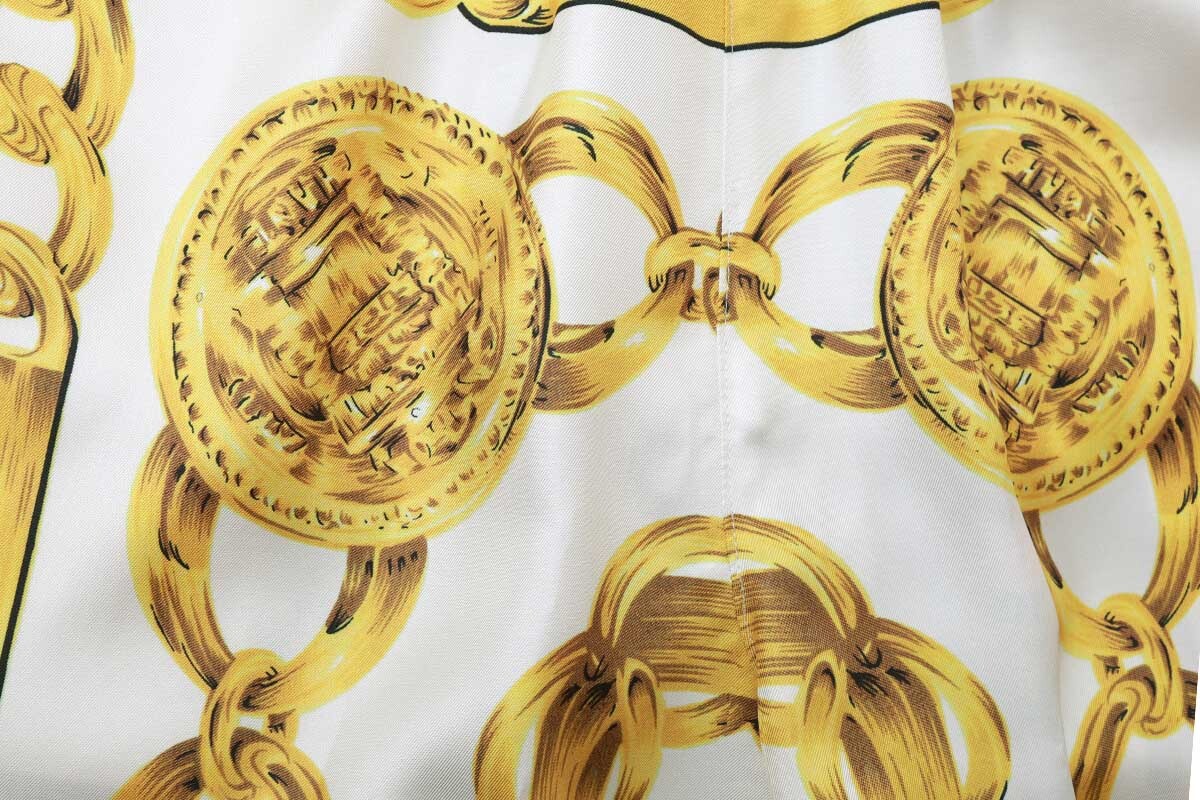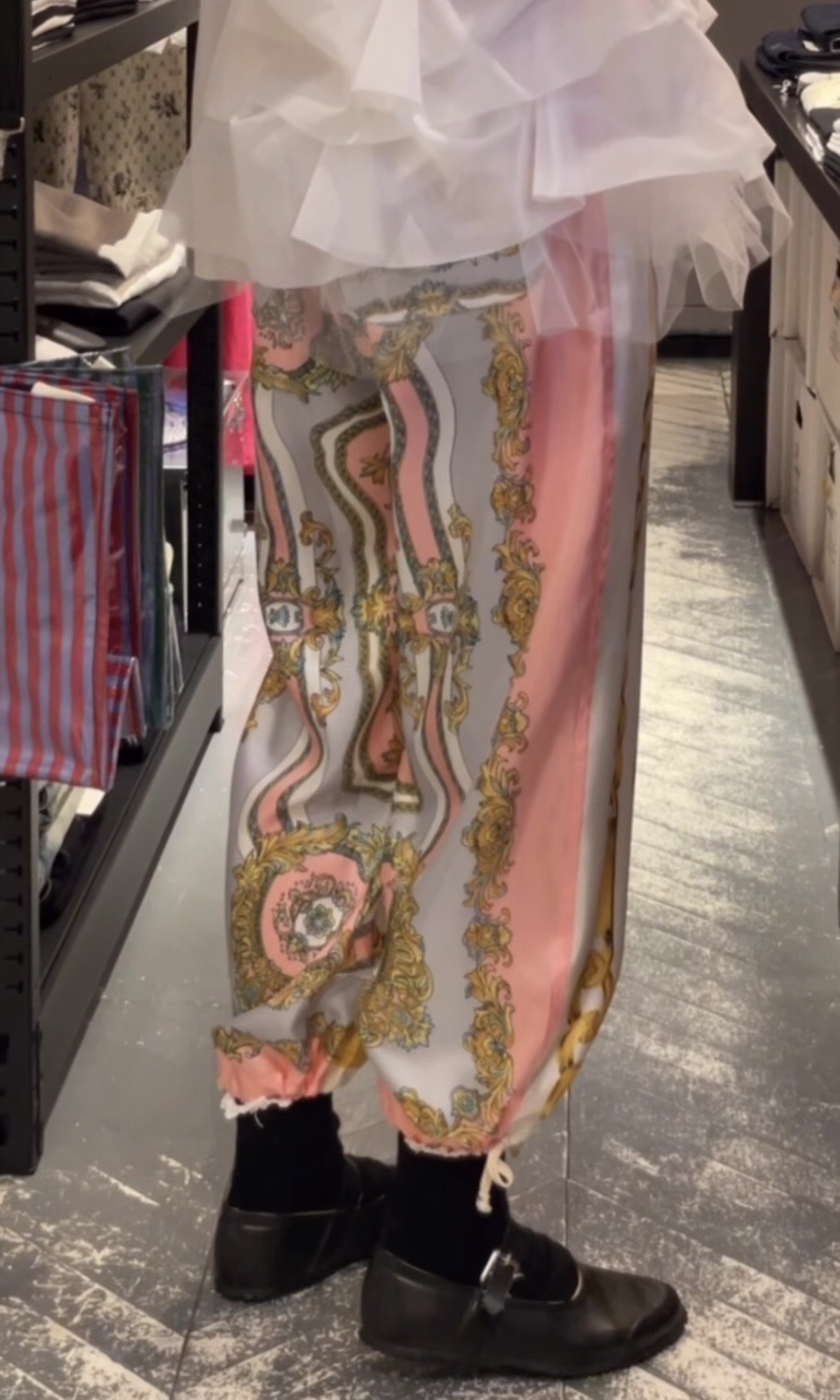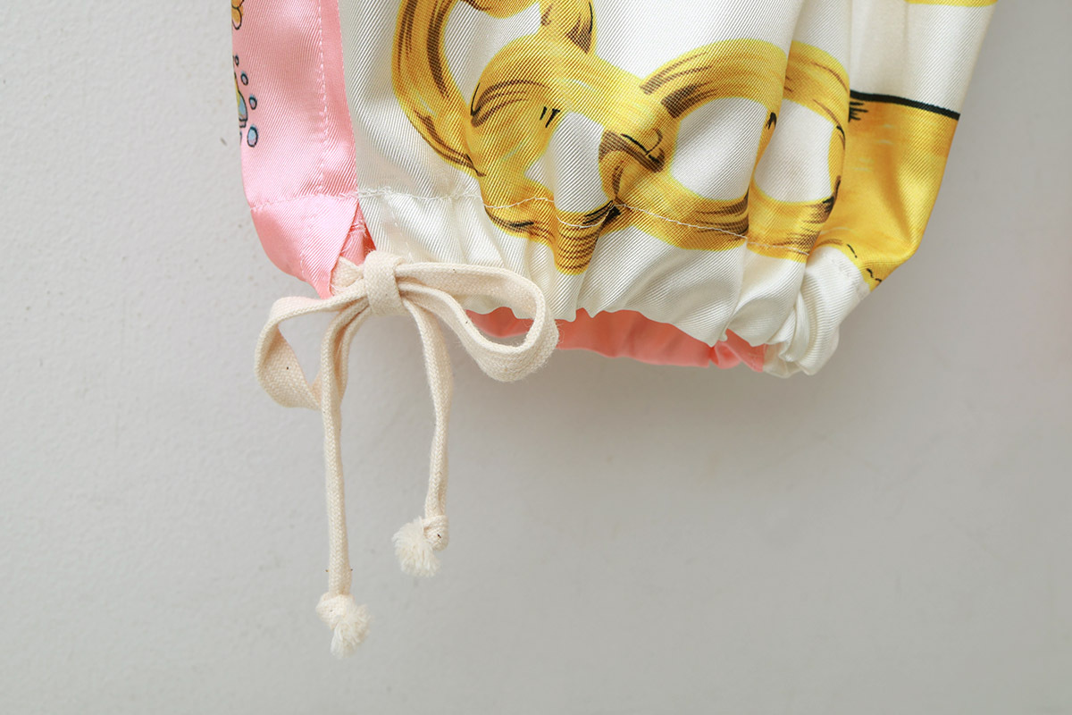 ゴージャスなスカーフ柄がプリントされたパンツ。裾の紐を解いてストンとシンプルにも裾を絞ってバルーンパンツのようにも履くことができます。コーディネートの主役になるパンツです。