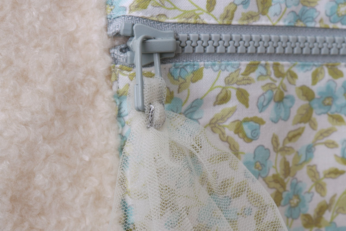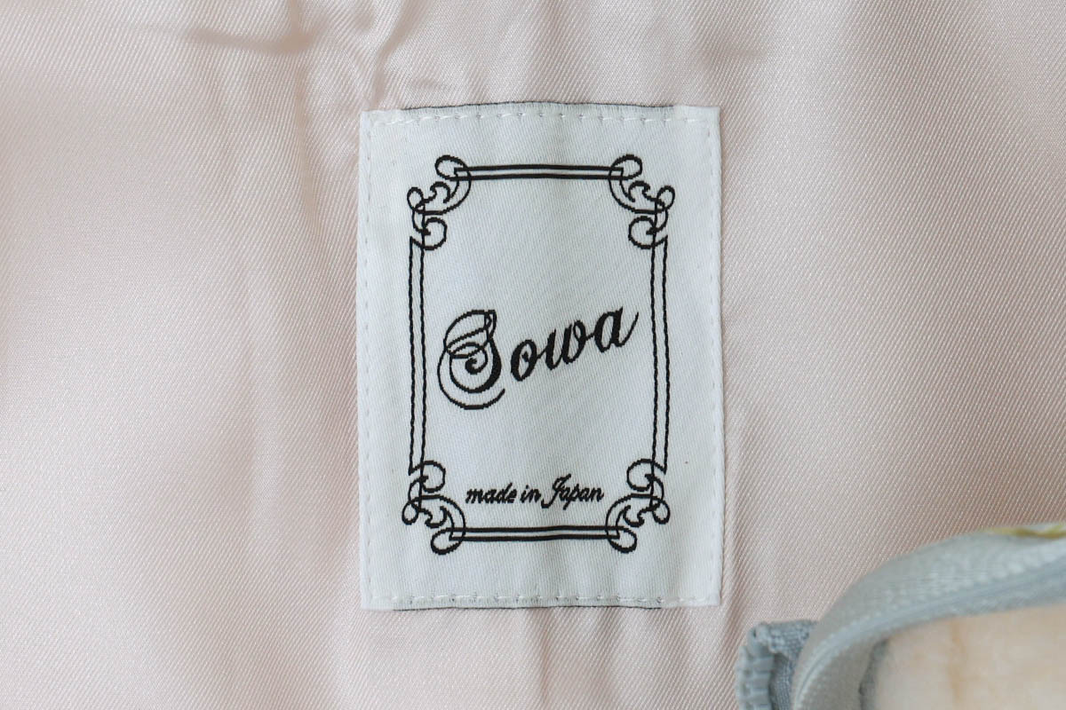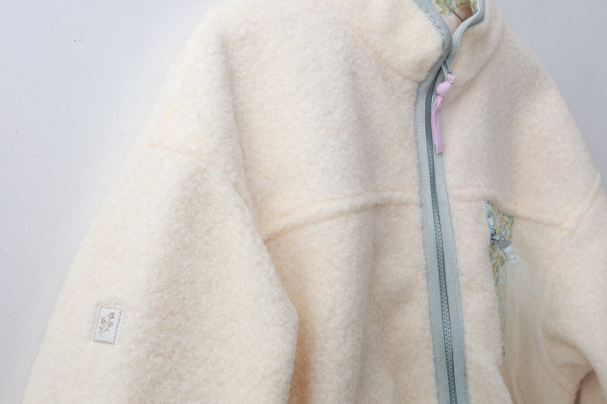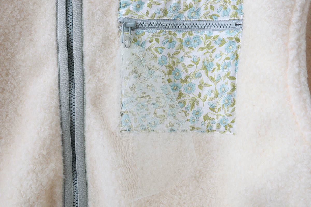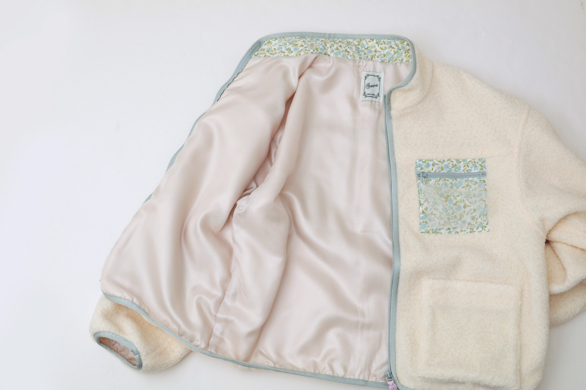 背中の大きなパッチには銀糸のステッチが入っていて、ファスナーの引き手には別珍リボンとチュール、左袖にお花のラベル付きでSOWAらしいこだわりがたくさん詰め込まれた寒い冬をハッピーにしてくれそうなジャケットです。