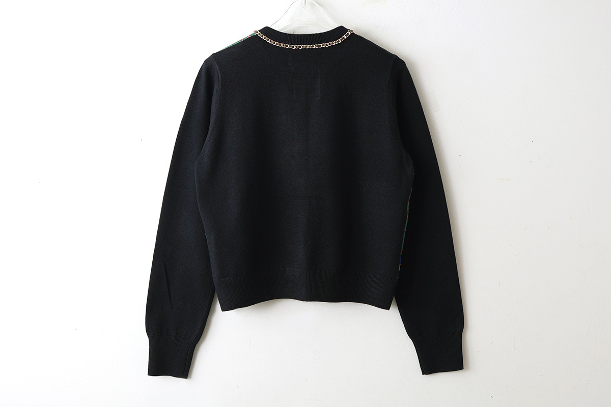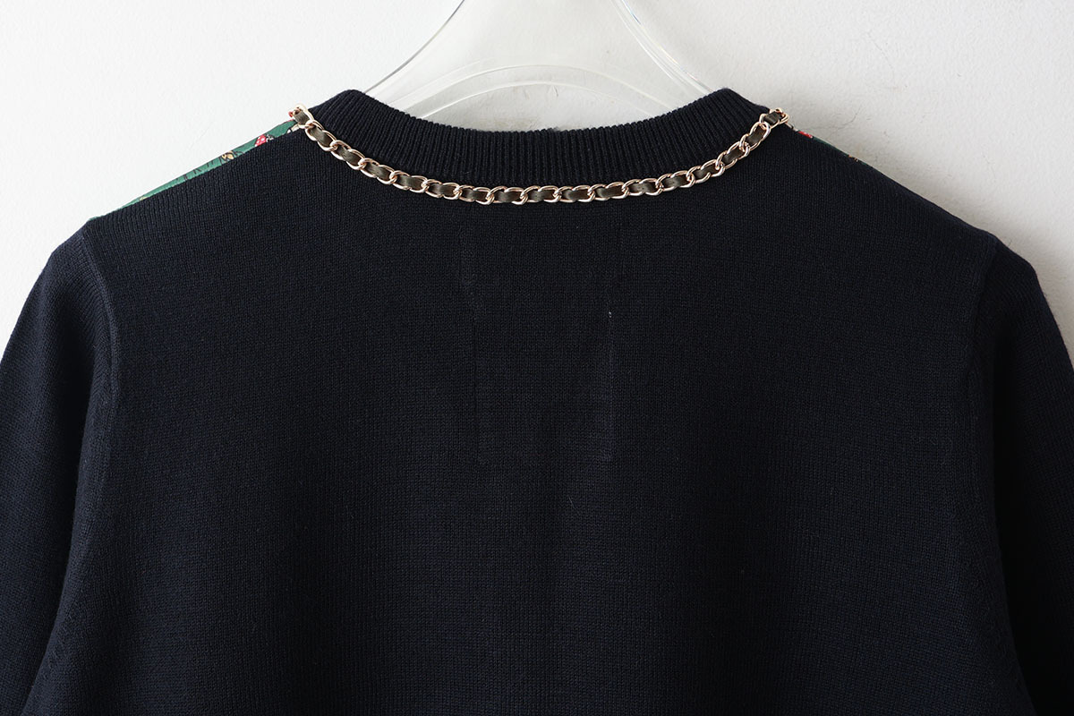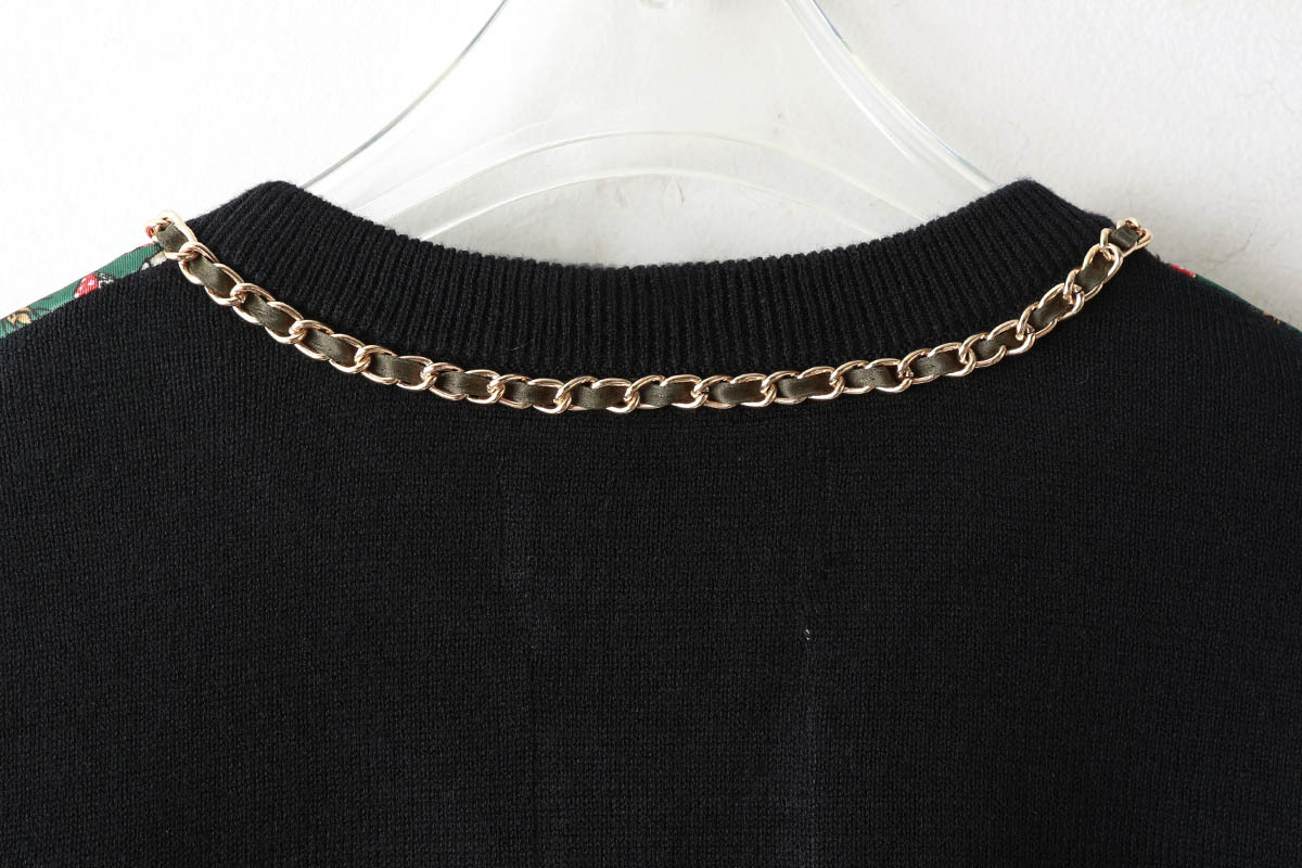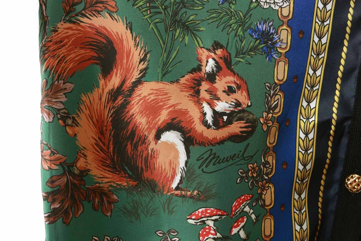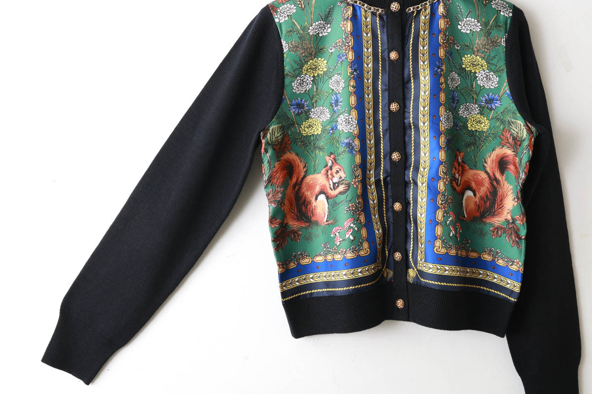 リスが描かれたオリジナルスカーフプリントがドッキングされたカーディガン。襟元にはリボンを通したチェーンが縫い付けてあり華やかさが添えられています。ゴールドボタンがポイント。