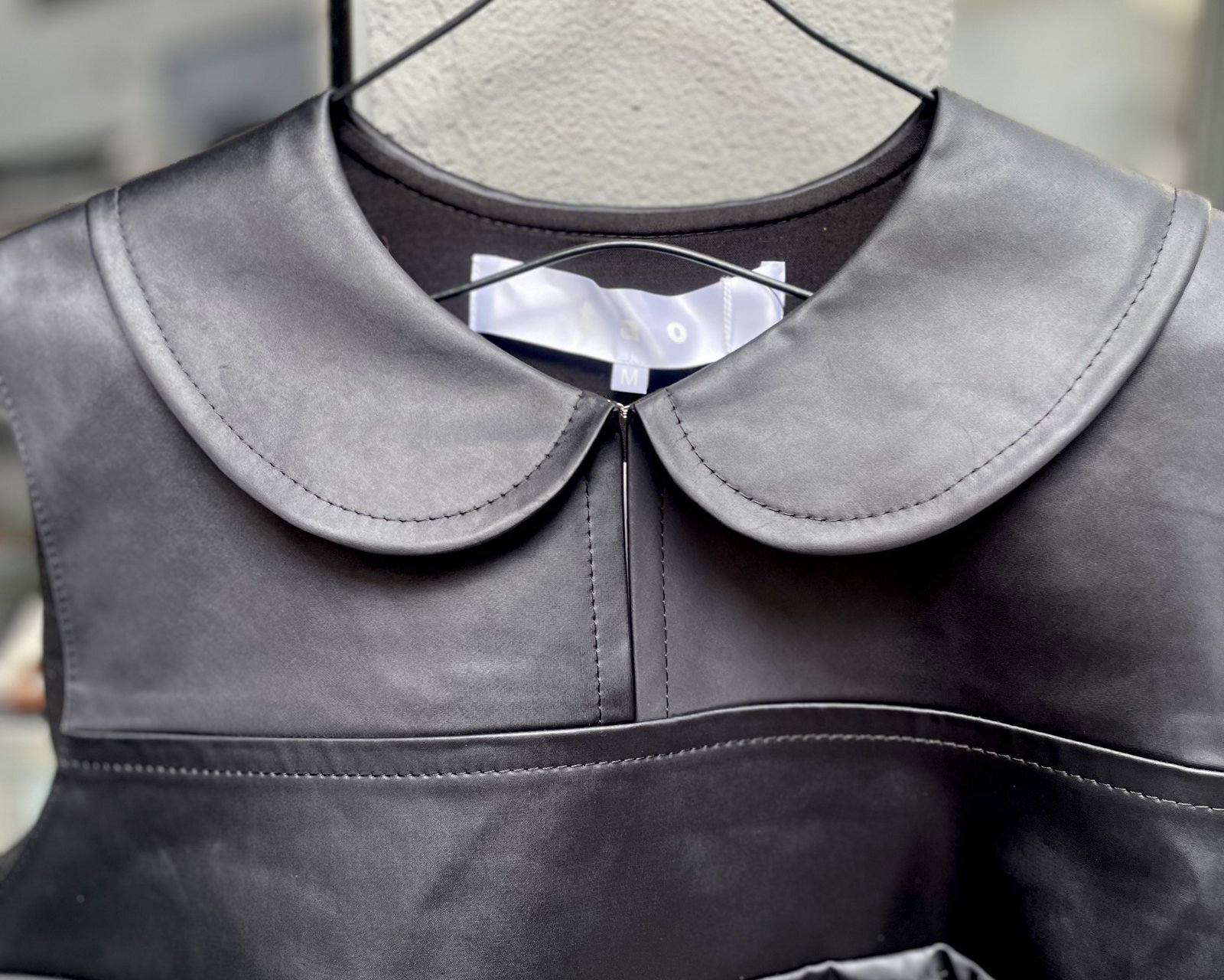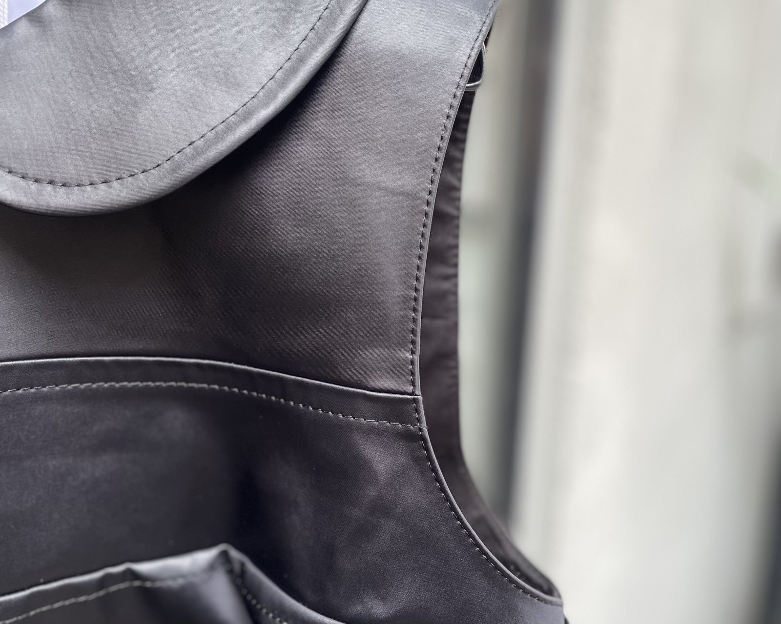 立体的なシルエットのベスト。レザーのような重厚感のある光沢はコーディネートにアクセントを加えます。ランダムのカットデザインからはブラウスなどのインナーが顔を覗かせます。