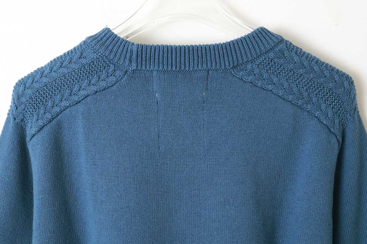 インターシャで編み込まれた肩の模様編みと、袖口に施された毛糸のブランケットステッチがポイント。