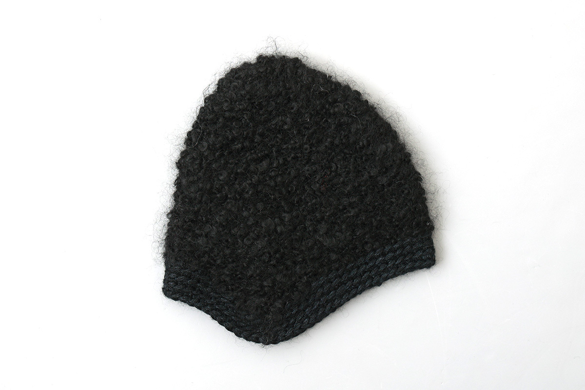 クルクルのモヘアループで編まれたふっくらふわふわのニットクロッシェ。耳当て付きデザイン。