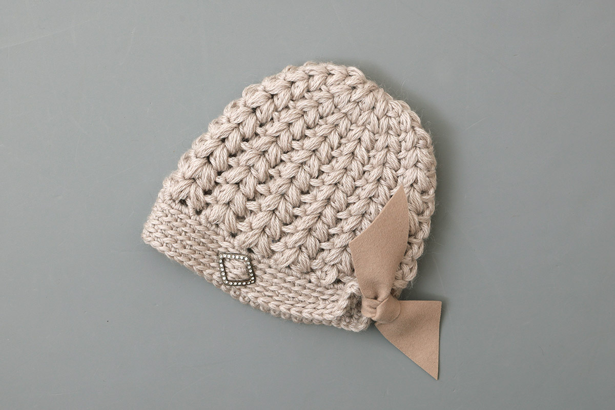 後ろにはフェルトリボン、サイドにはきらりと光るアンティーク調のボタンがアクセントになっています。