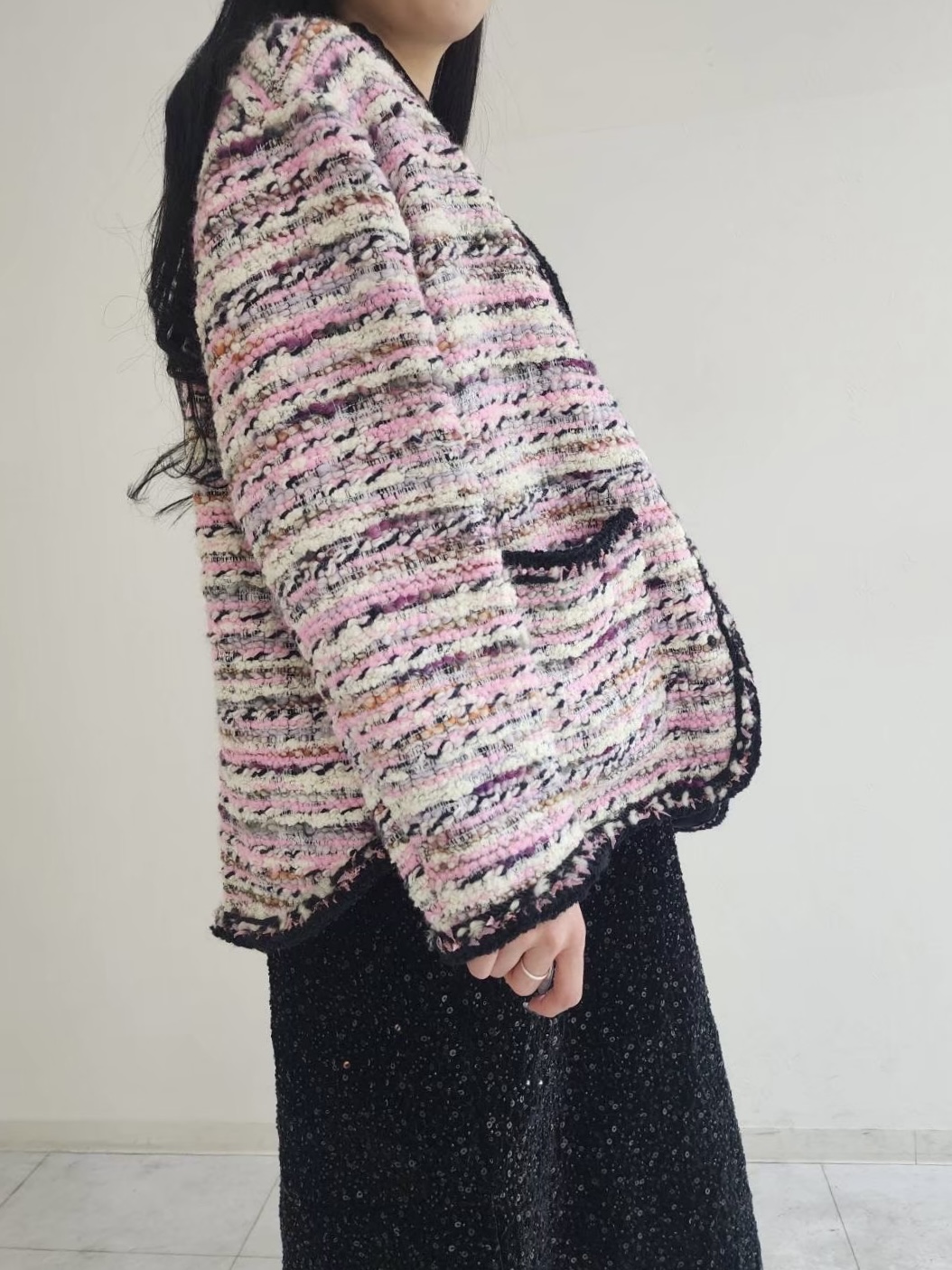 フランスのマリア・ケント(MALHIA KENT)社のツイードを使用したジャケットです。襟ぐりから前立て、袖口やポケット口のトリミングには全て手編みのブレードが施されており、細部にわたって丁寧な手仕事のぬくもりが感じられます。
