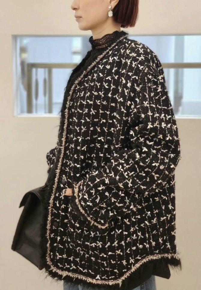 | 素材 | 表地/ポリエステル42% ナイロン22% コットン10% レーヨン10% アセテート7% アクリル7% 麻2% 裏地/キュプラ100% 別布/ポリエステル100% 裾リブ部分/ポリエステル60% 毛40% |