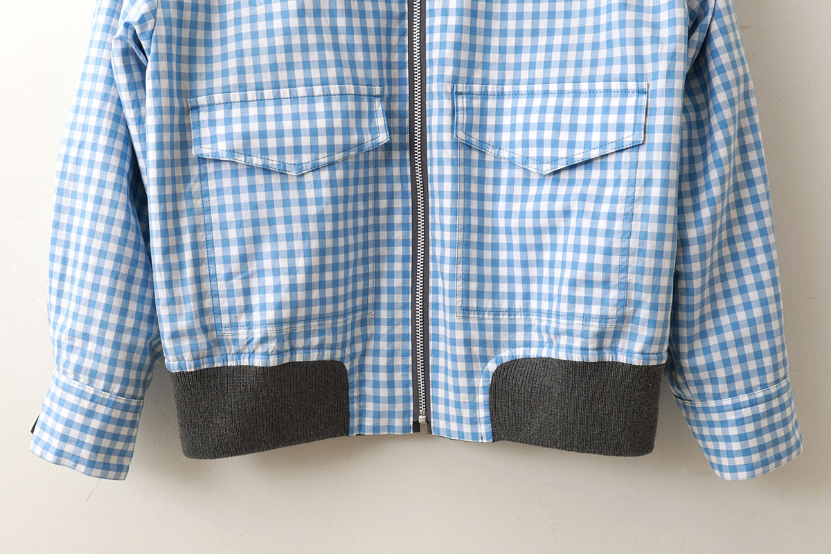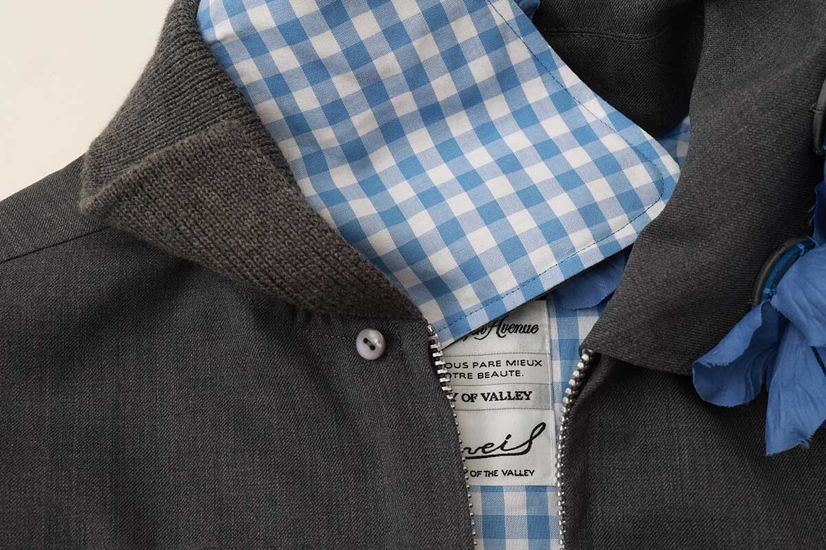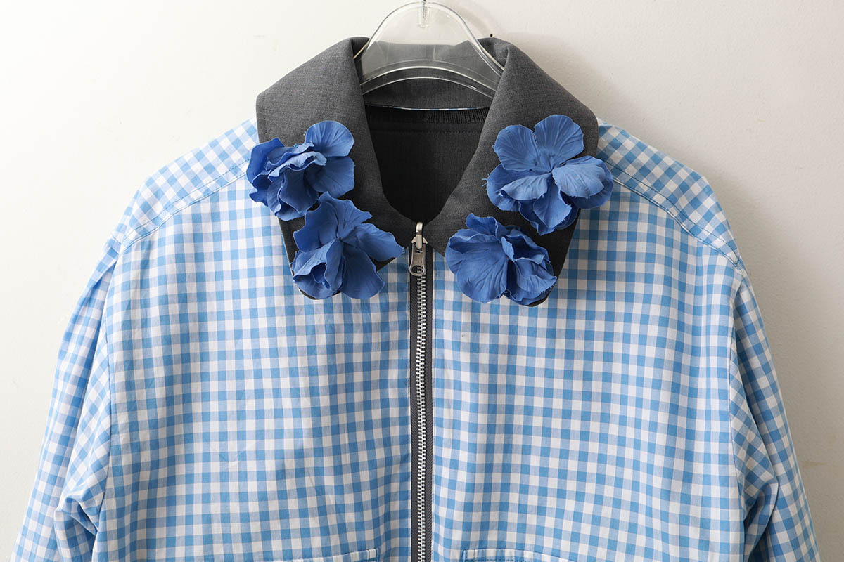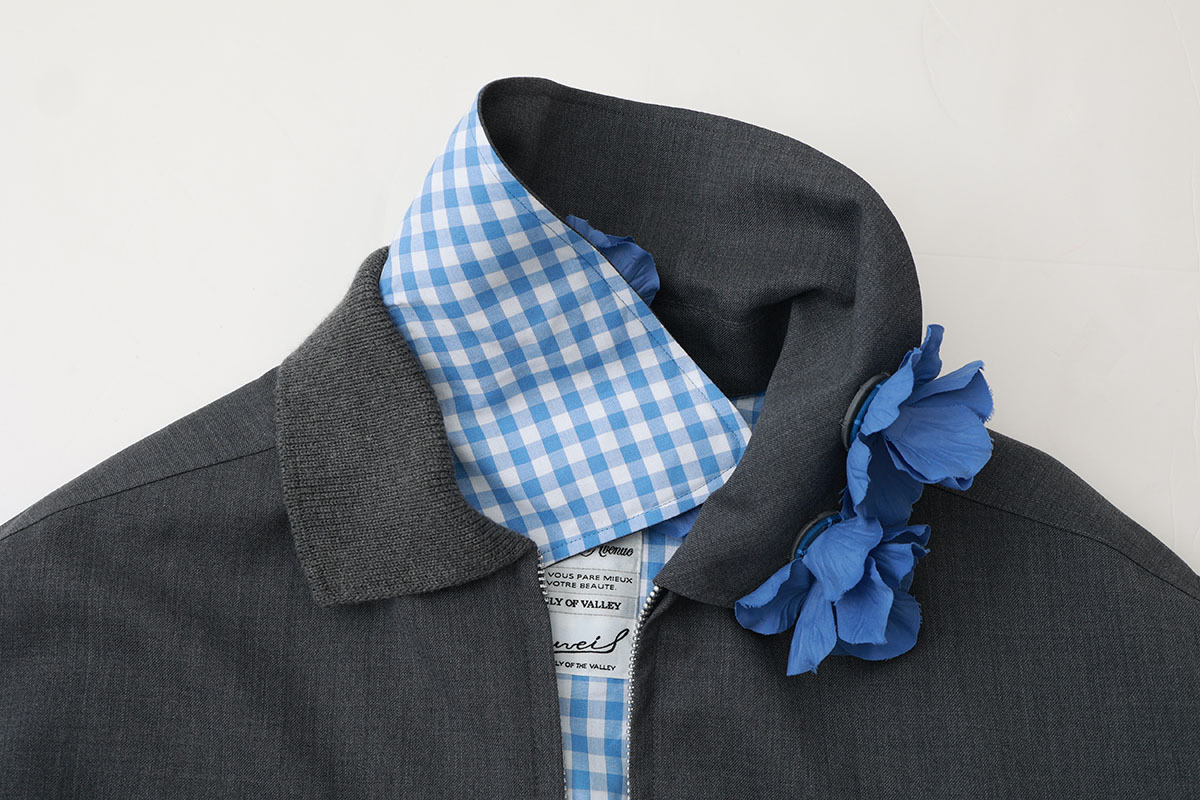 レトロな表情のスウィングトップブルゾン。コットンのギンガムチェックとのリバーシブル仕立てで気分によって表情を変えられます。編み立てた衿にレザーライク素材の可憐なコサージュが施されています。同素材を使用したレースショートウールパンツとのスタイリングもおすすめです。