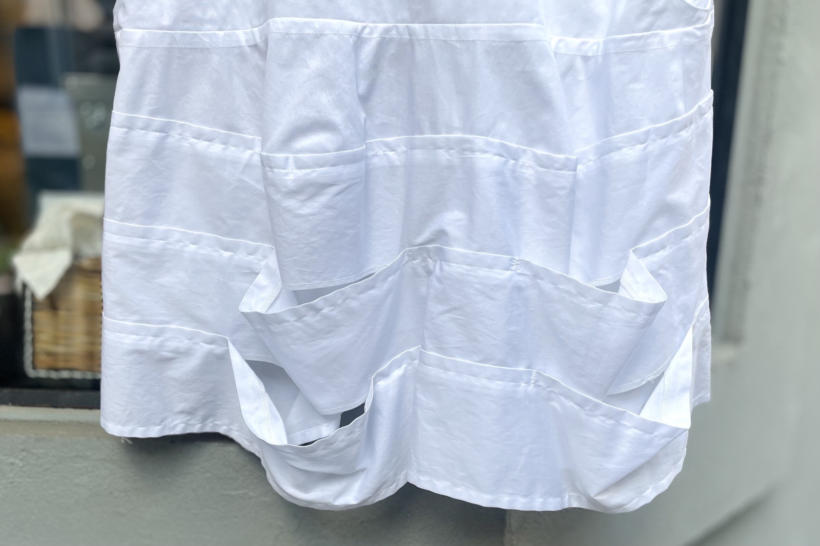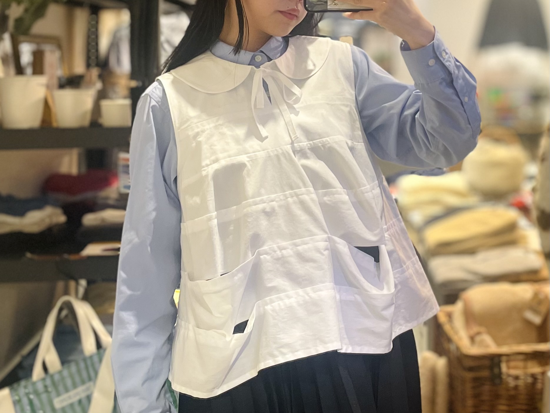 立体的なシルエットのブラウス。重なり合うティアードからのぞく空洞は、インナー合わせが楽しくなる遊びのデザイン。大きな丸襟とリボンを活かした重ね着もおすすめです。