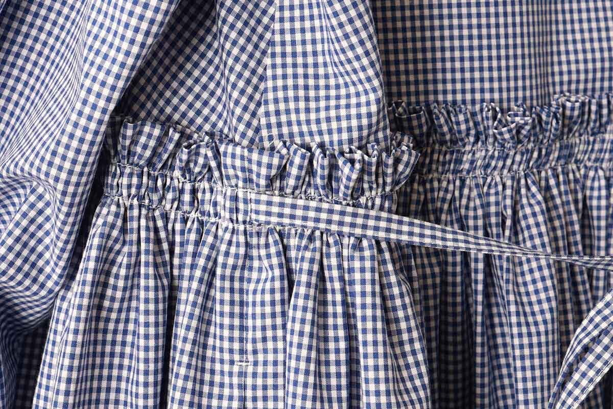 立体感のあるパフスリーブと丸襟が印象的なワンピースです。たっぷりのギャザースカートは空気を含んだように軽やか。ウエスト脇についた共布リボンを絞ることでシルエットを変えて楽しむことができます。