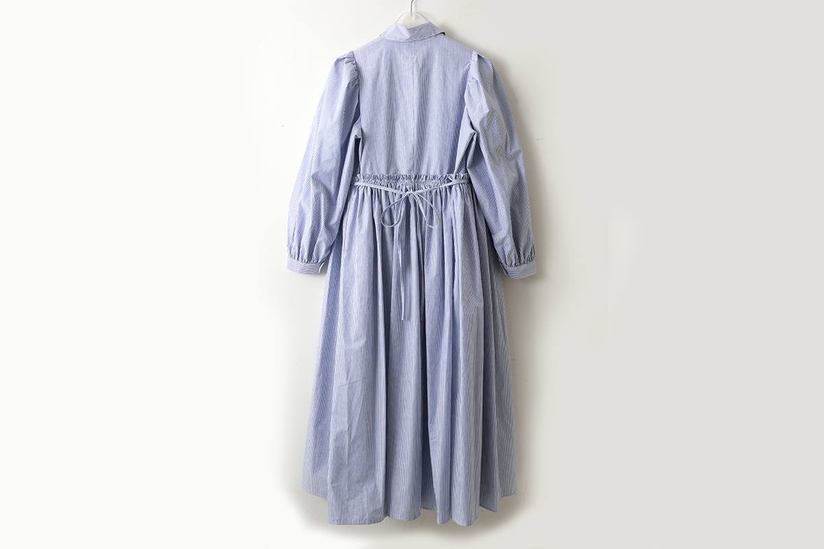 立体感のあるパフスリーブと丸襟が印象的なワンピースです。たっぷりのギャザースカートは空気を含んだように軽やか。ウエスト脇についた共布リボンを絞ることでシルエットを変えて楽しむことができます。