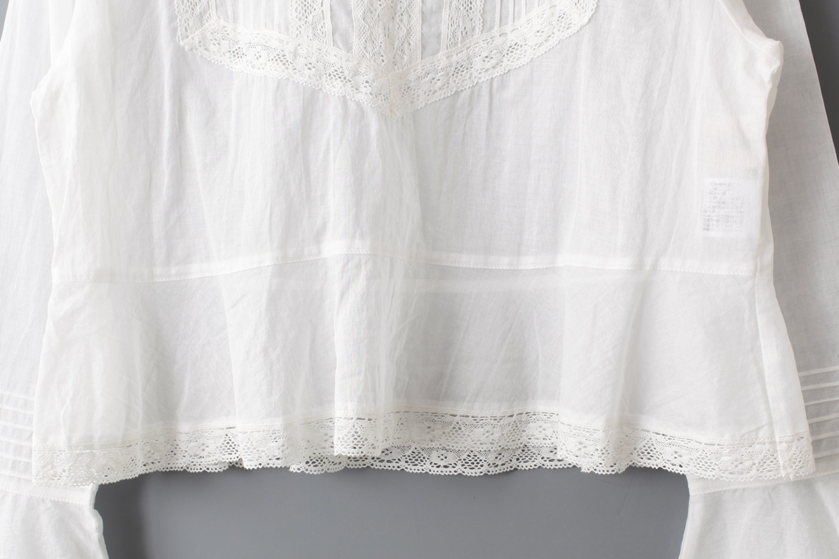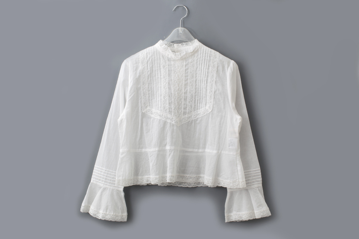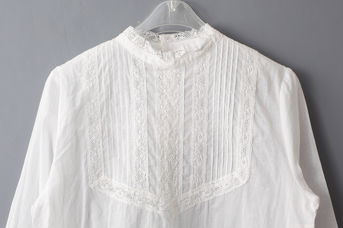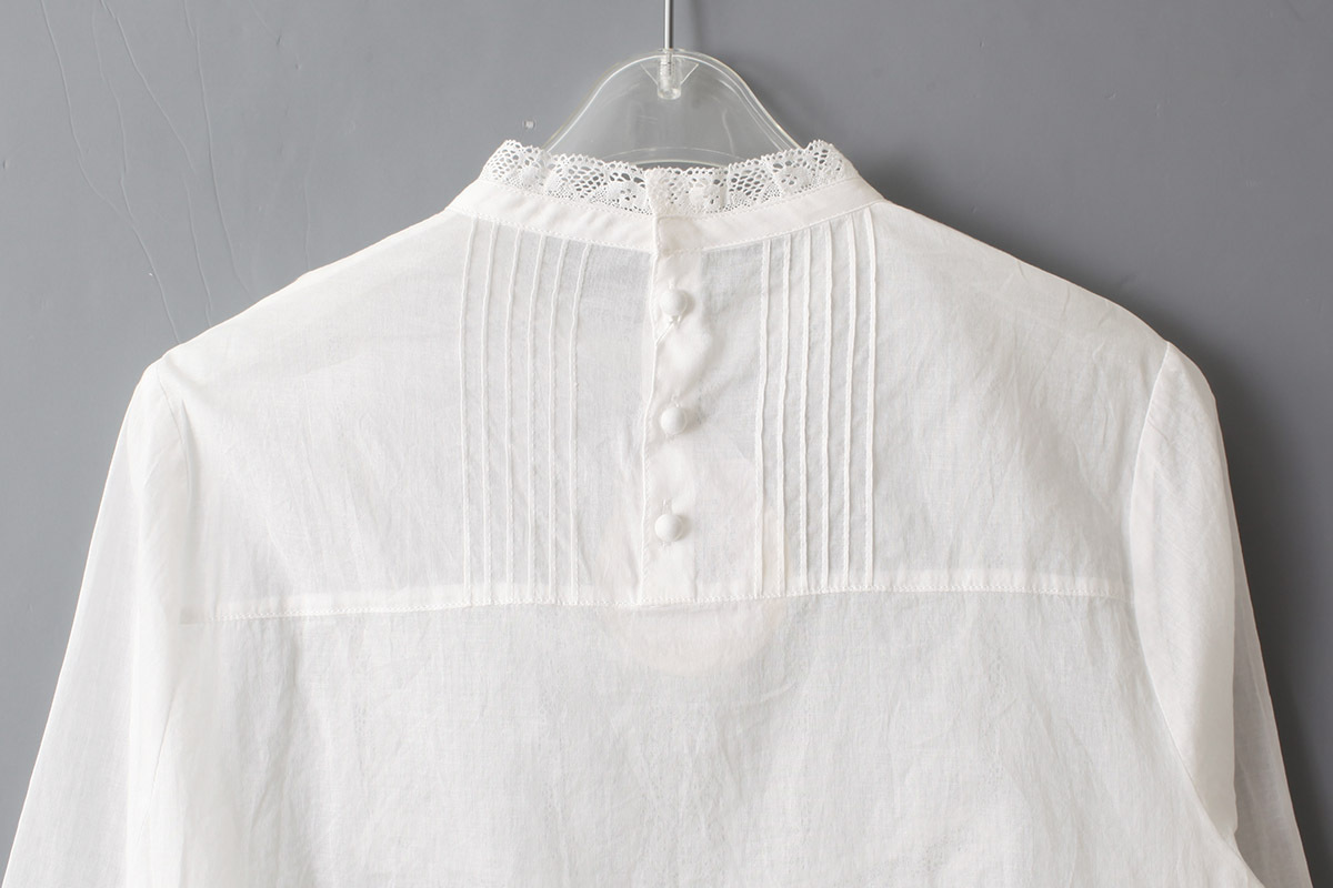 繊細で軽い生地で、ヨーク部分や袖にはピンタックとレースをふんだんに施されており、ヴィンテージのような雰囲気に。