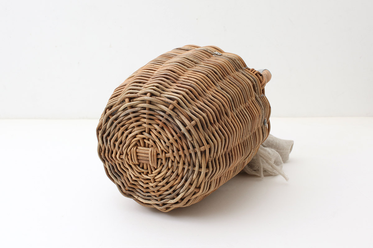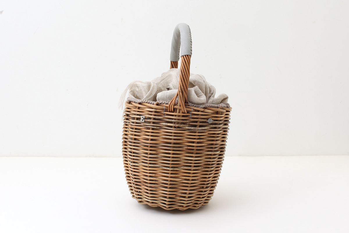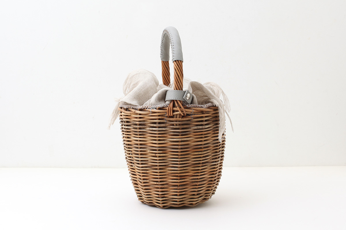 とても強く、使うほどに色・ツヤが変化してくる無骨な紅籐のかごバッグに、厚みとコシがありながらもフニャフニャした感触が特徴のシュリンク・エンボスレザーを組み合わせたかごバッグです。深さがあるデザインですので、長財布を縦に入れて頂けます。控えめなEのプレートがポイント。麻100%のかぶせは取り外し可能。裏地はチュールにナイロン綿入りのポケットです。