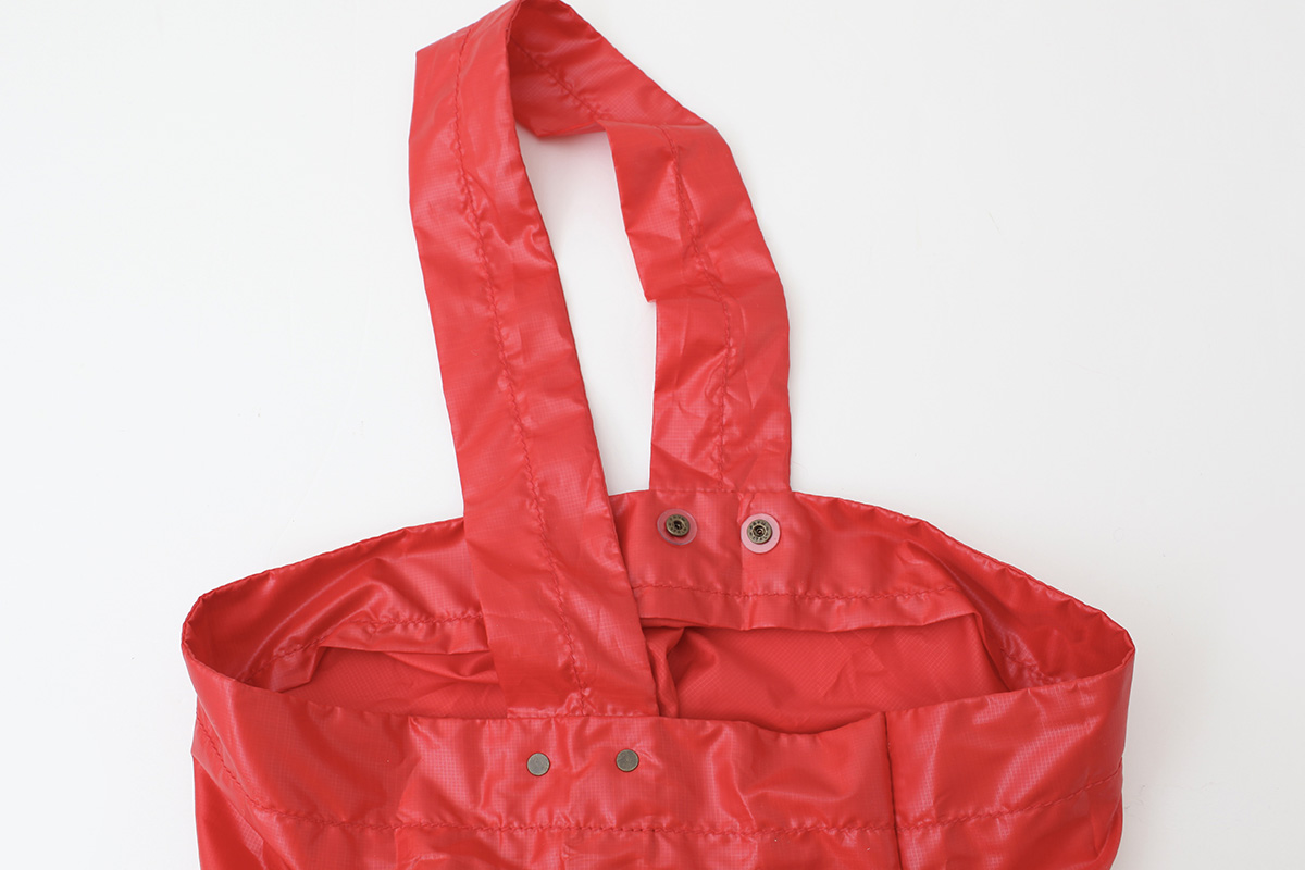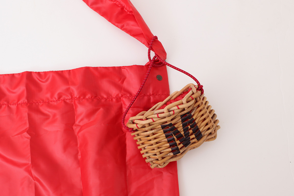 ポリエステル100%のペットボトルより作られる再生繊維のサブバッグです。高密度繊維に撥水加工を施しているので、防水、撥水性に優れています。大きめサイズでA4の冊子も十分に入る大きさです。eb.a.gosらしい遊び心のある籐のケースは普段はバッグに付けてチャームのようにも使えます。