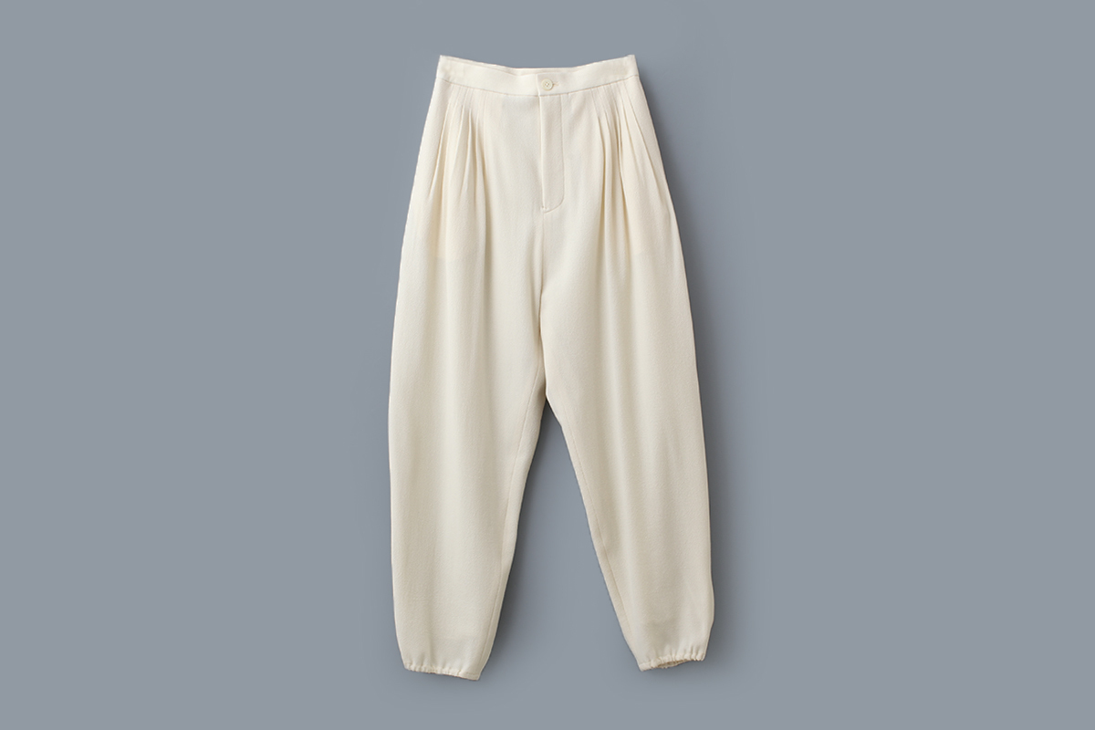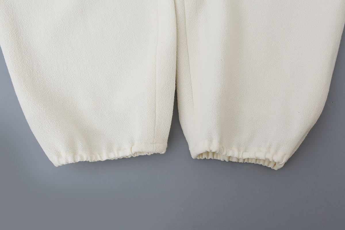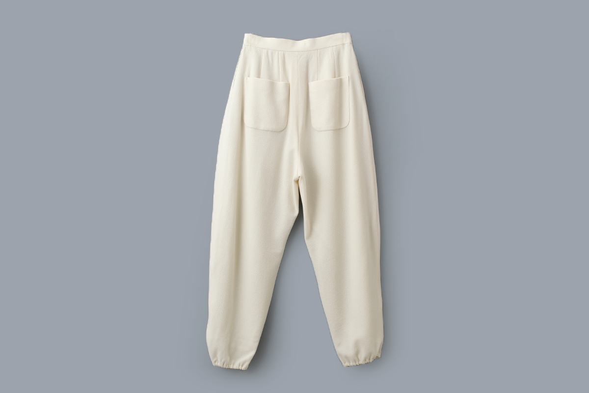 | 商品説明 | どこか懐かしく、ぬくもりを感じさせる表情のテキスタイル“crystal sugar(クリスタル シュガー)”。強撚ウール糸で織り上られたシボ感のある生地は、粒子の粗い砂糖のような風合いです。タック入りのテーパードパンツは、裾にゴムギャザーを寄せて、膨らむような丸みのあるシルエットに仕上げられています。ラフな雰囲気ながら、生地の豊かな風合いがコーディネートを引き立てます。セットアップで着用できる同素材のジャケット「forest parade ブルゾン (AES2445) 」もございます。 |