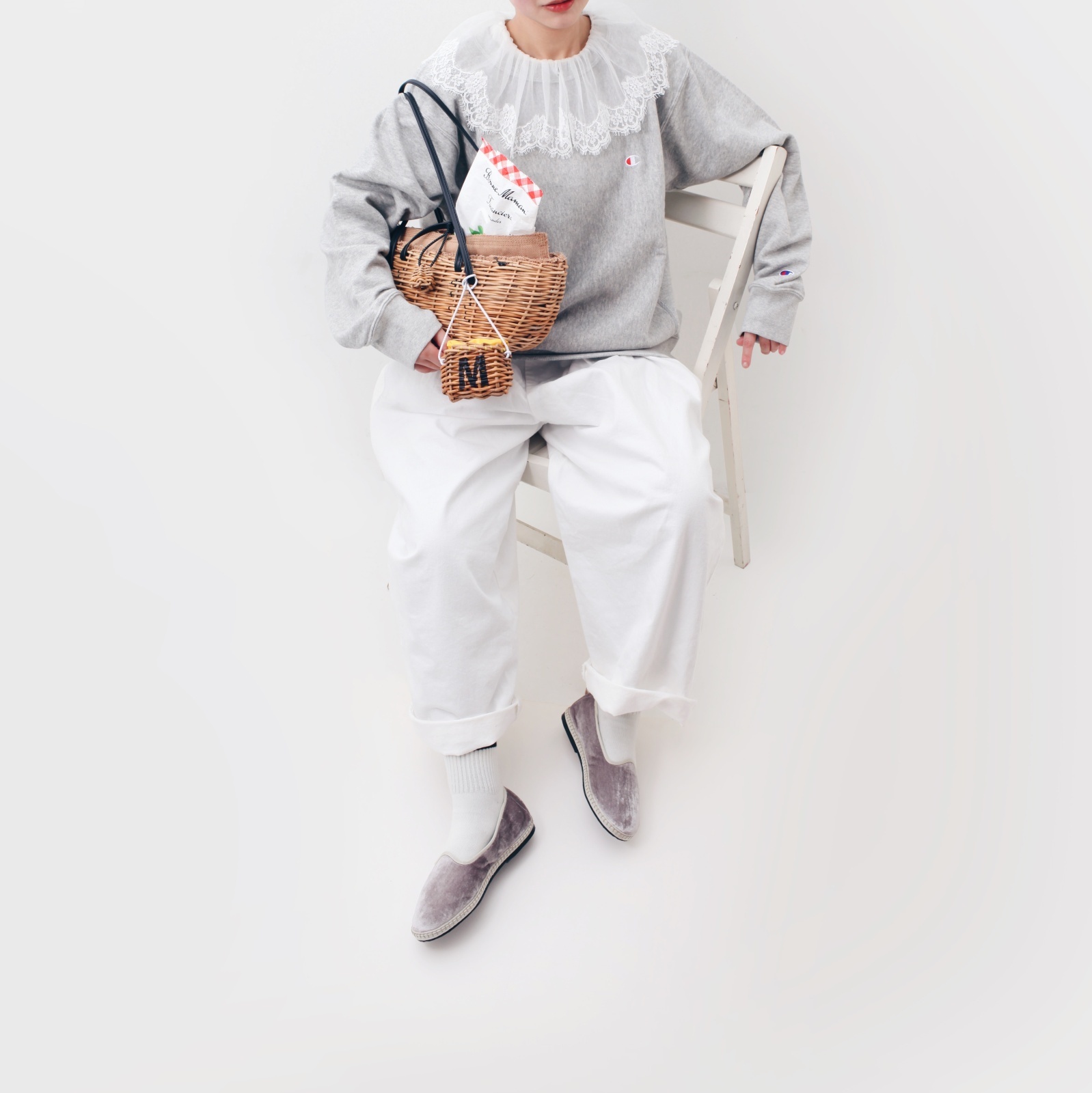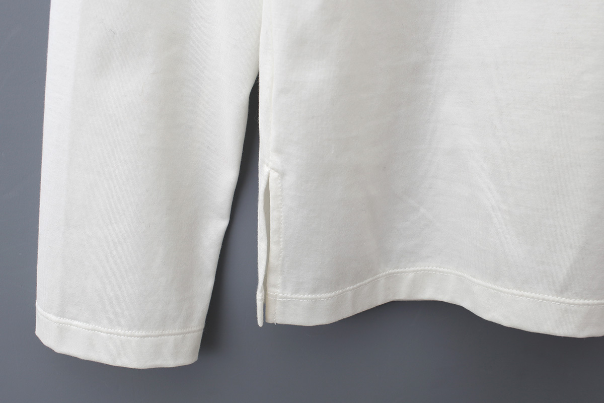 通常より時間をかけ紡績した糸を使用した優しい風合いと美しいさらりとした表面感が特徴のカットソー素材。透明感のあるトリコット生地と、ヴィンテージのようなのり付け加工を施したレースを使用。