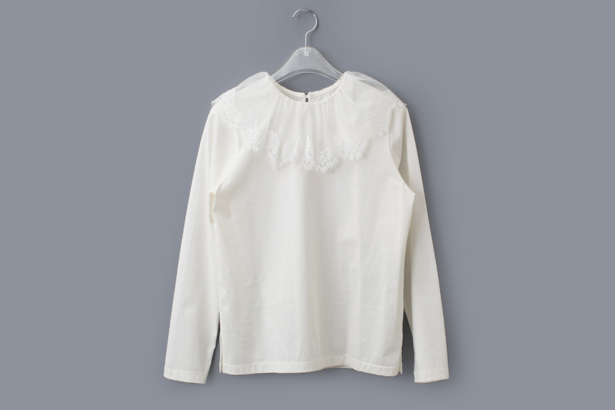 襟のレースを出してニットやワンピースなどとレイヤードを楽しんでいただけるカットソーです。