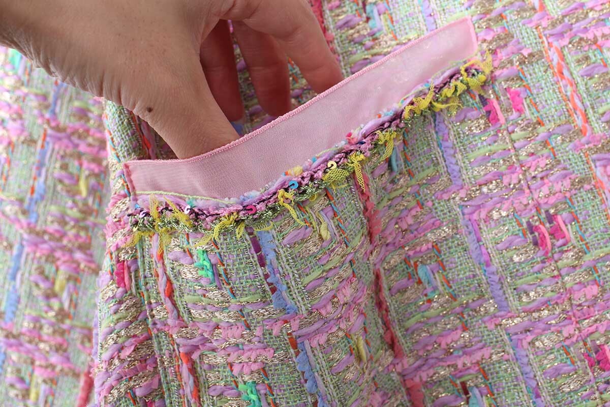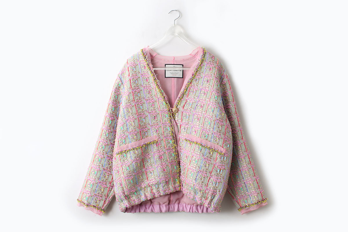 ペーパーヤーンやリリヤンなど、色とりどりの数種類の糸が織り込まれた自由で豊かな表情を持つCHANELツィードでお馴染みの、フランス・MALHIA KENT社のツィードでつくられたジャケット。