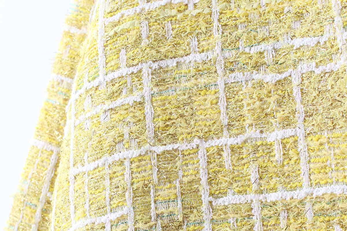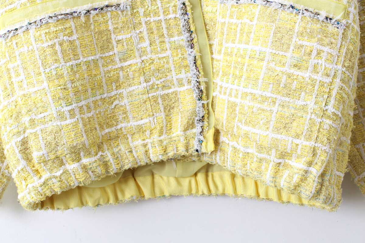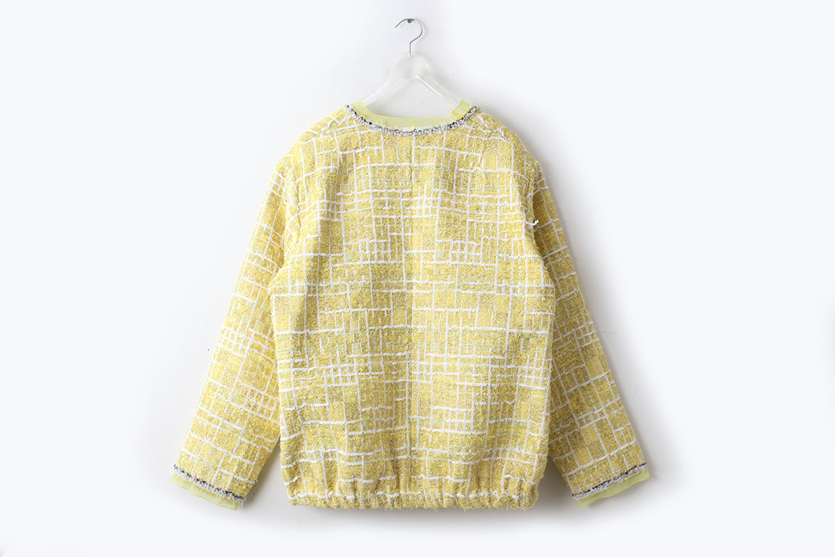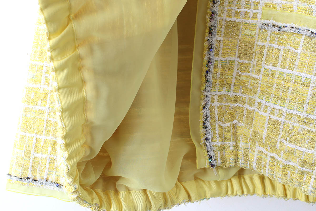 ペーパーヤーンやリリヤンなど、色とりどりの数種類の糸が織り込まれた自由で豊かな表情を持つCHANELツィードでお馴染みの、フランス・MALHIA KENT社のツィードでつくられたジャケット。