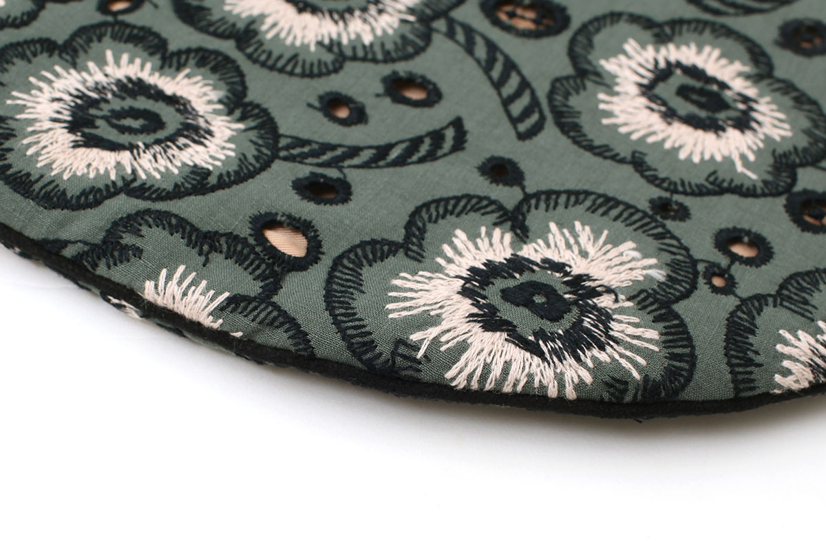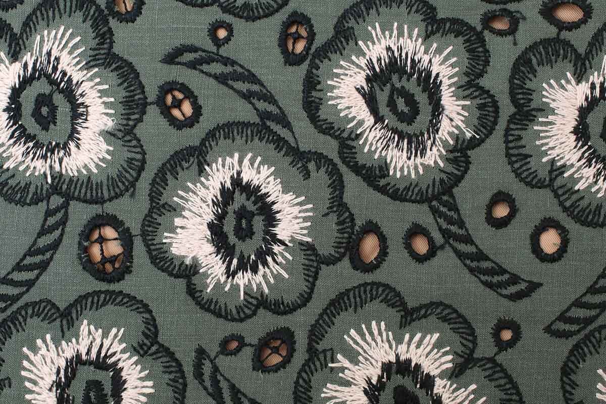 生地いっぱいにお花の刺繍が浮かぶ“candy flower(キャンディー フラワー)”。花の茎をキャンディーのスティックのような斜めボーダーで描いた、遊び心のある刺繍のテキスタイルです。花芯部分は刺繍糸を重ねてふくらみと奥行きを持たせた立体的な表現に、花々の周りにはボーラー刺繍を散りばめました。手仕事を思わせるような素朴なステッチが、あたたかみのある表情を添えています。 |