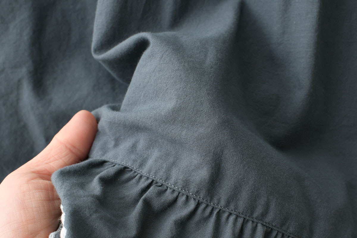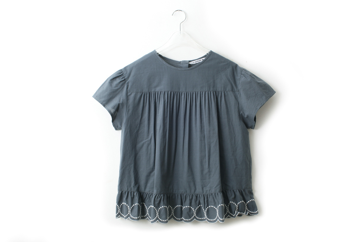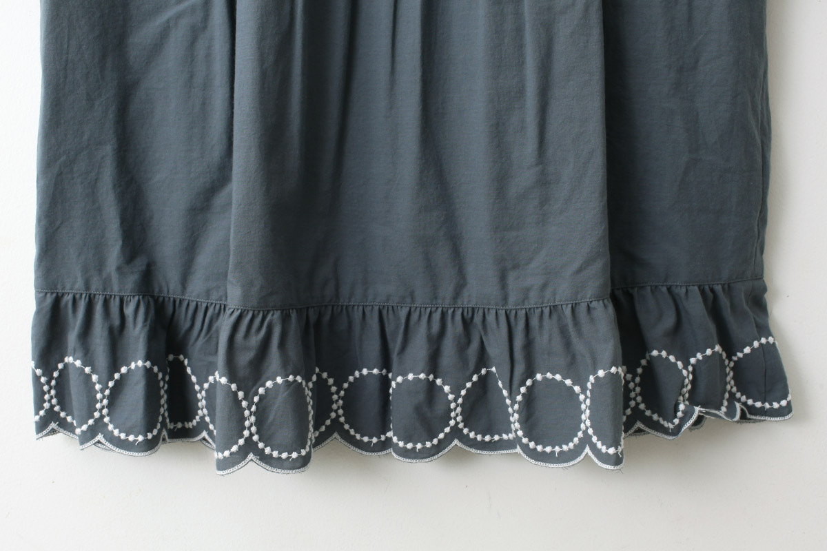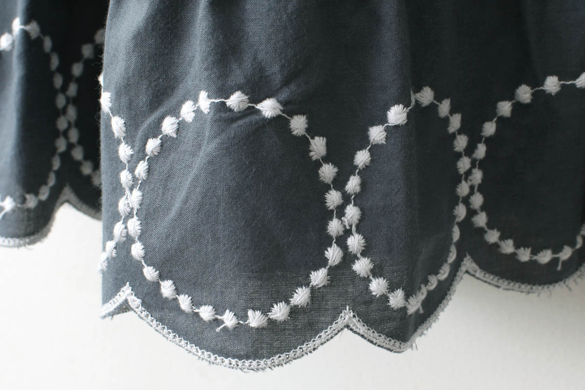 tambourineの刺繍に沿ってスカラップされた裾のデザインがかわいい一枚です。小柄な大人の方もご着用いただけます。