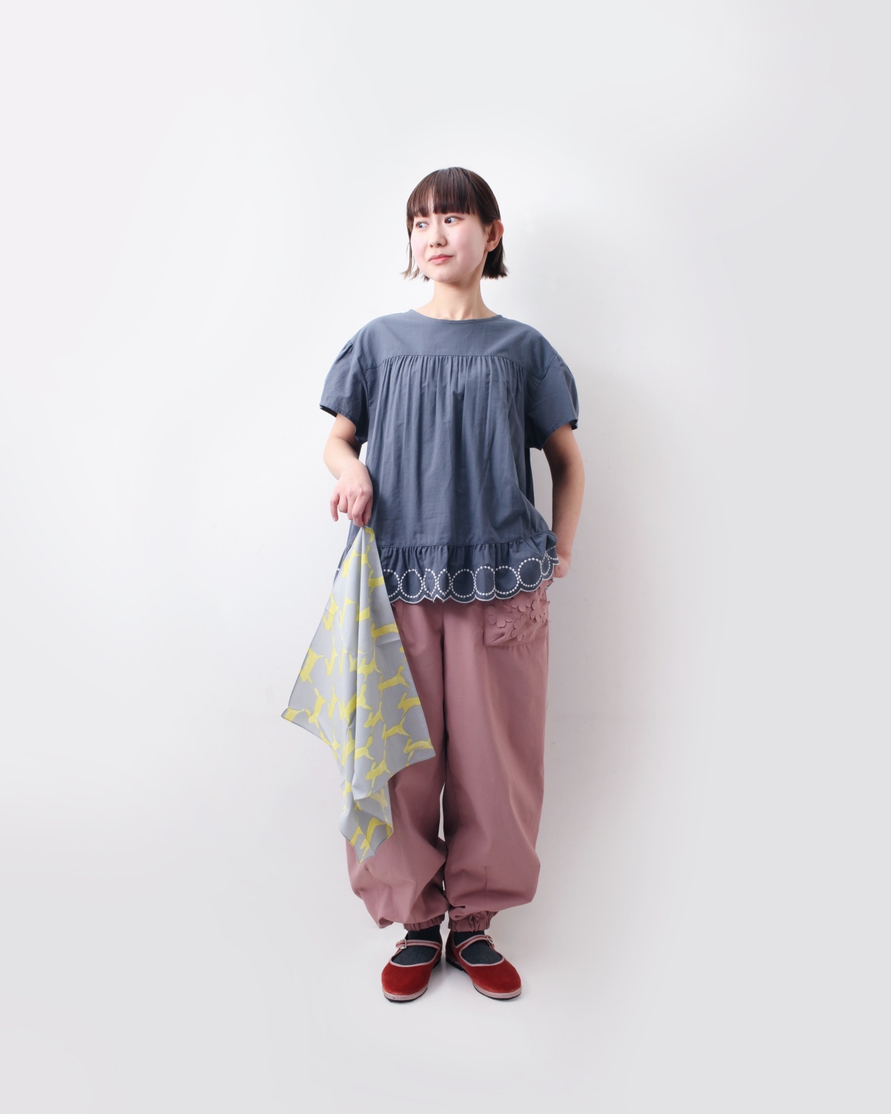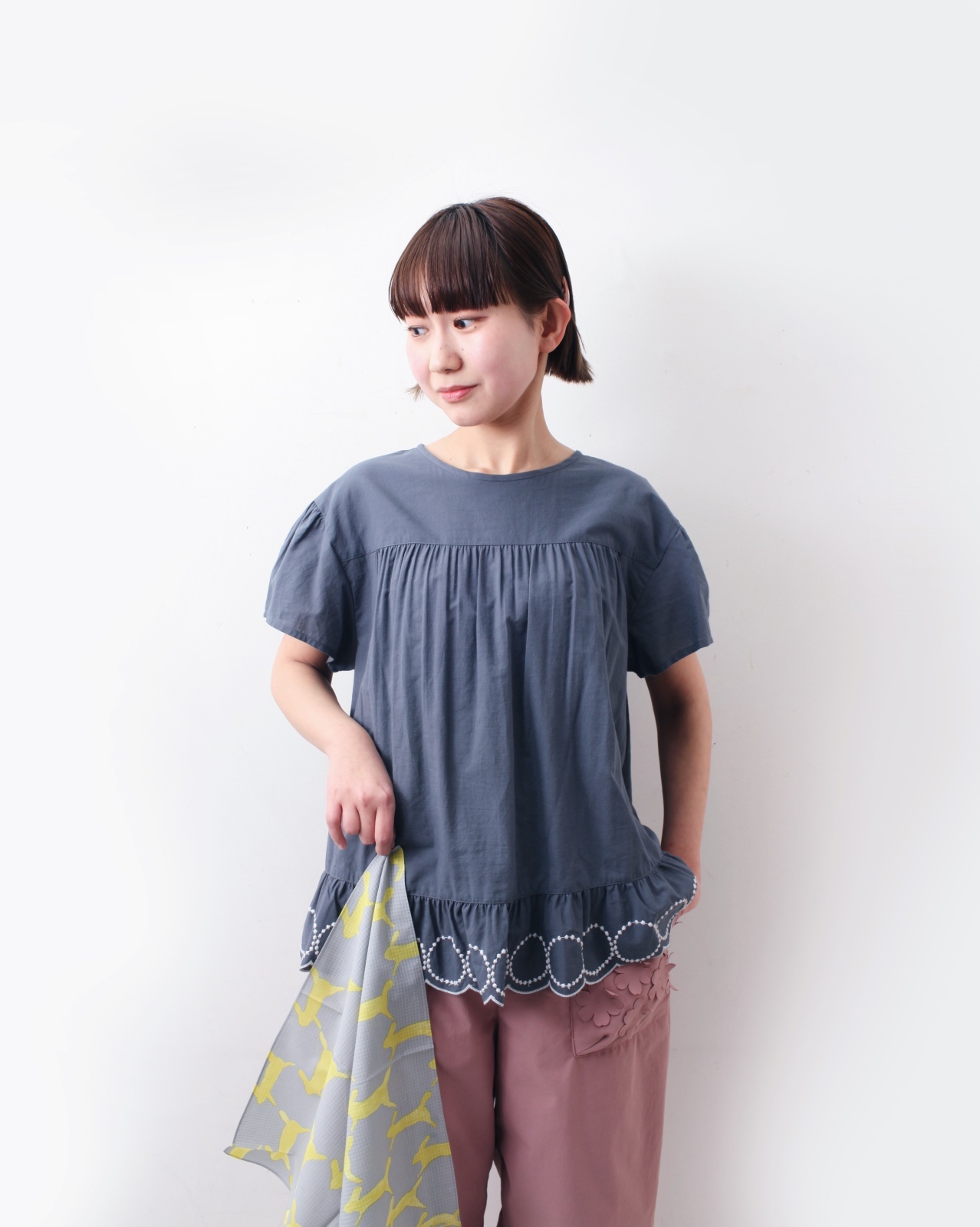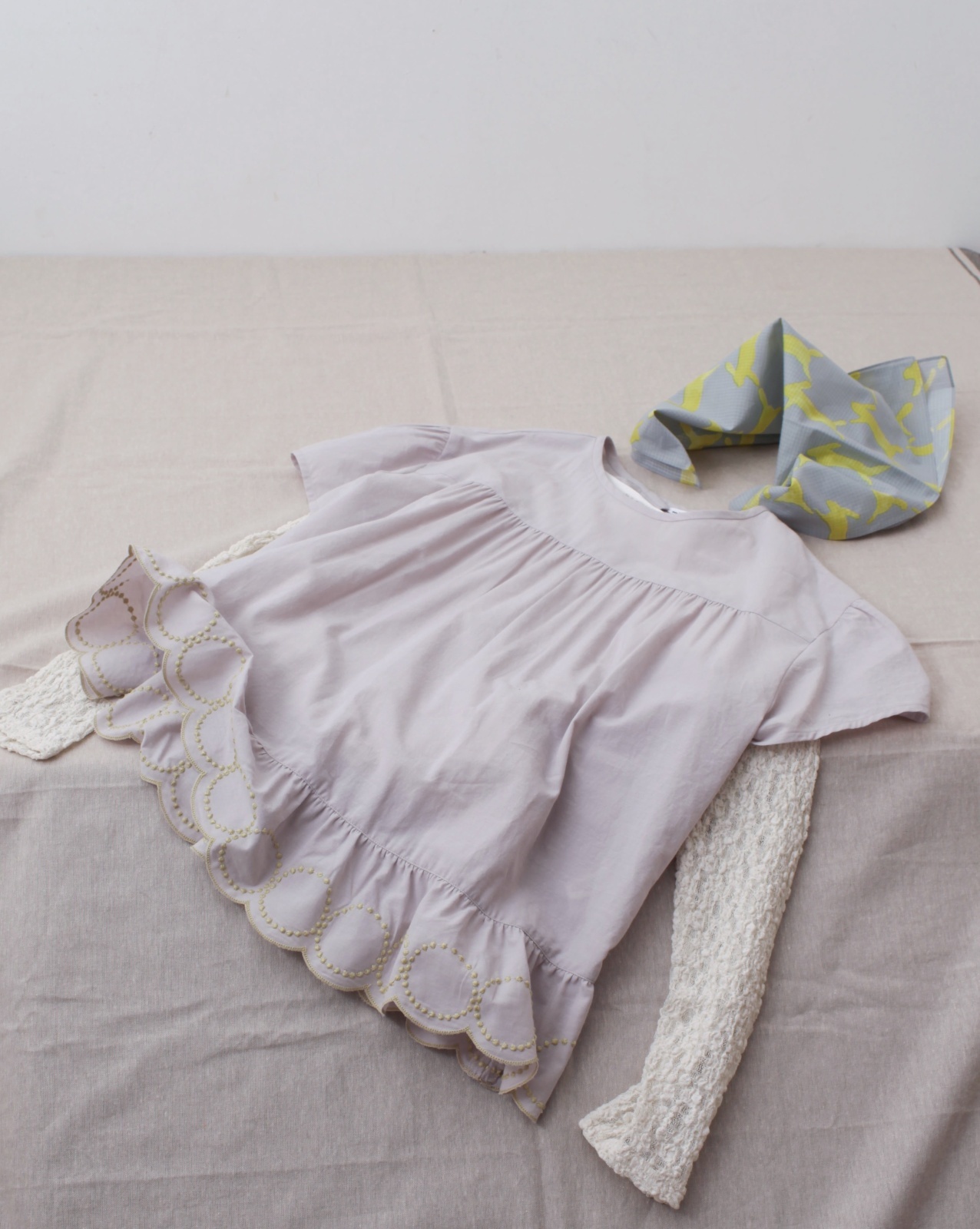 tambourineの刺繍に沿ってスカラップされた裾のデザインがかわいい一枚です。小柄な大人の方もご着用いただけます。