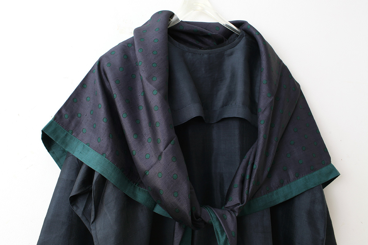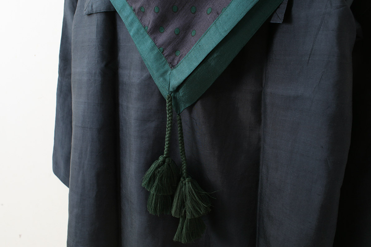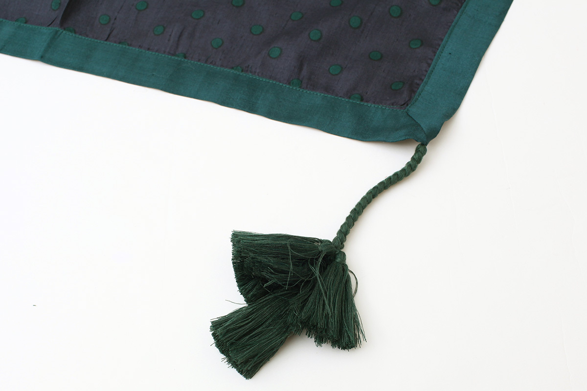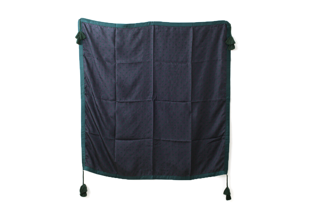 大判の正方形のスカーフです。絶妙な配色のドットプリント。四隅の角についたタッセルがポイント。