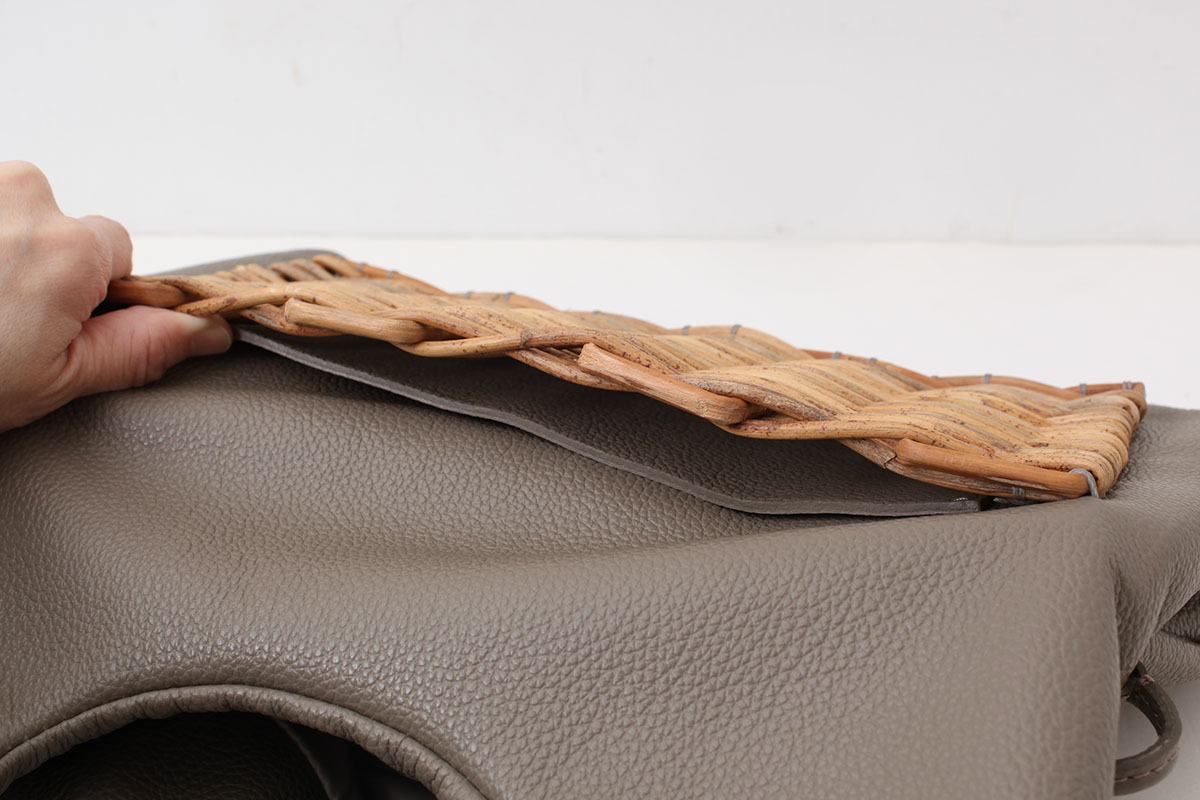 かごには裏がついていないので、スマホ等を入れた際に傷つかないようにさらに革のポケットがつけられています。