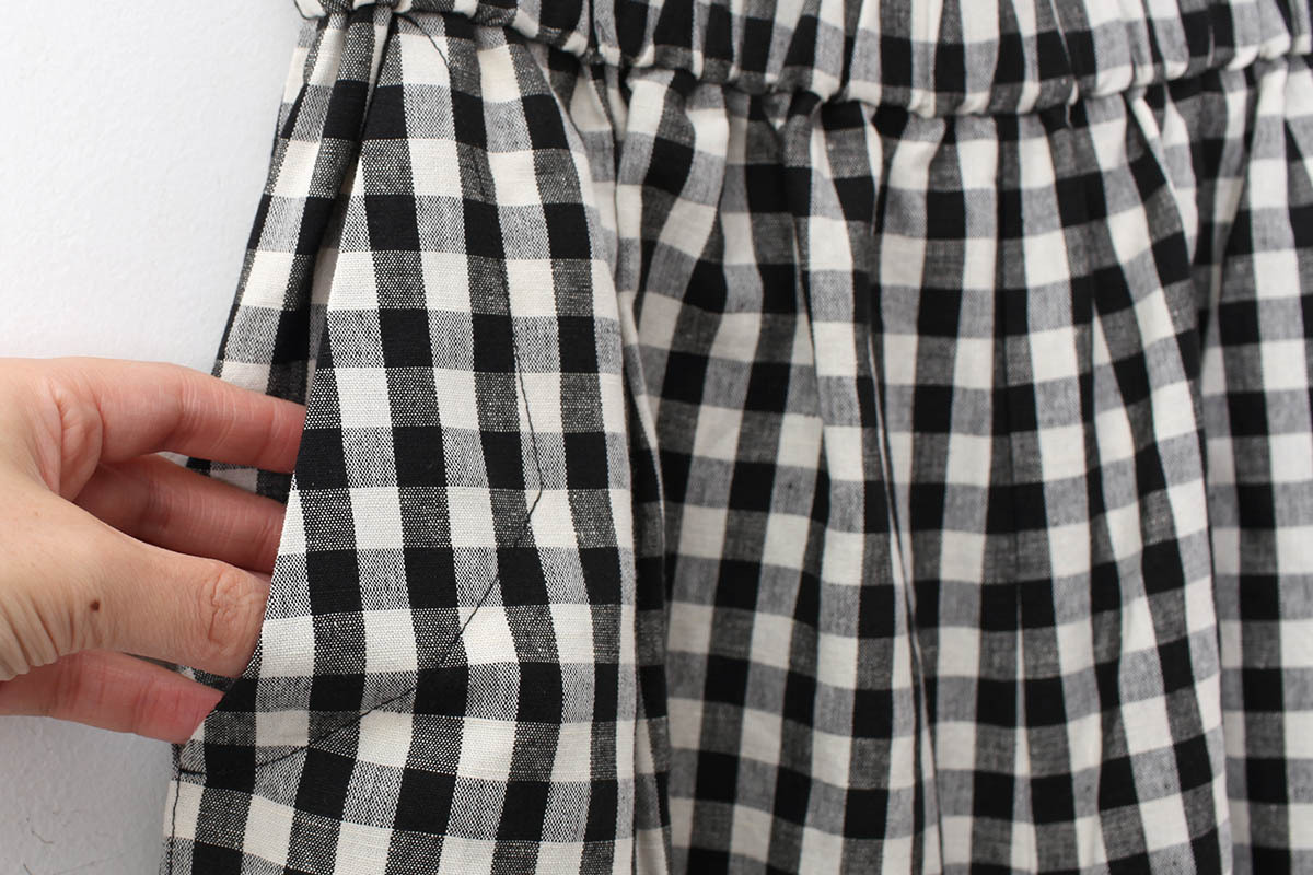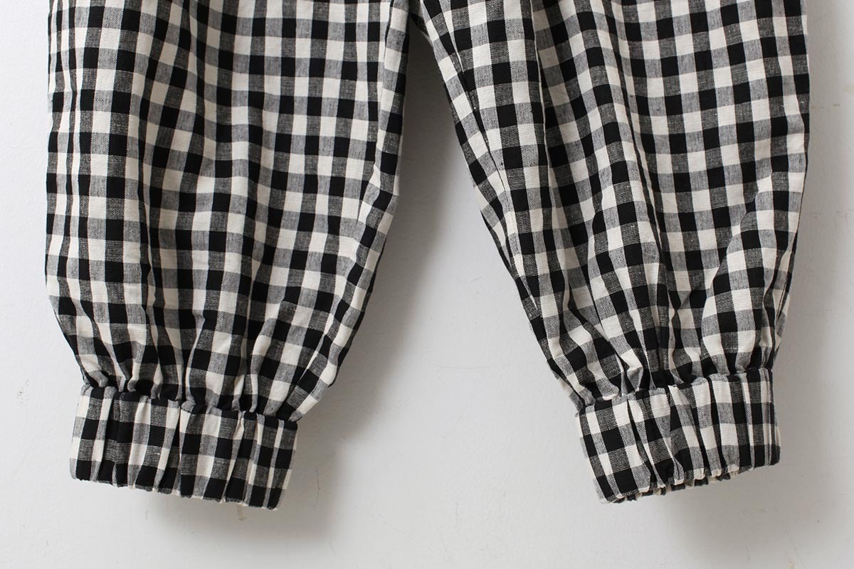 きゅっと締まった裾が特徴的なパンツ。リネン特有の風合いの残る生地はふんわりと肌触りも心地よく、ウエストと裾はゴムになっているためゆったりとお召しいただけます。そのままブラウスやTシャツと合わせていただくのはもちろん、ワンピースの下に重ね着をするのもおすすめです。さまざまな着こなしでお楽しみ頂けるアイテムです。