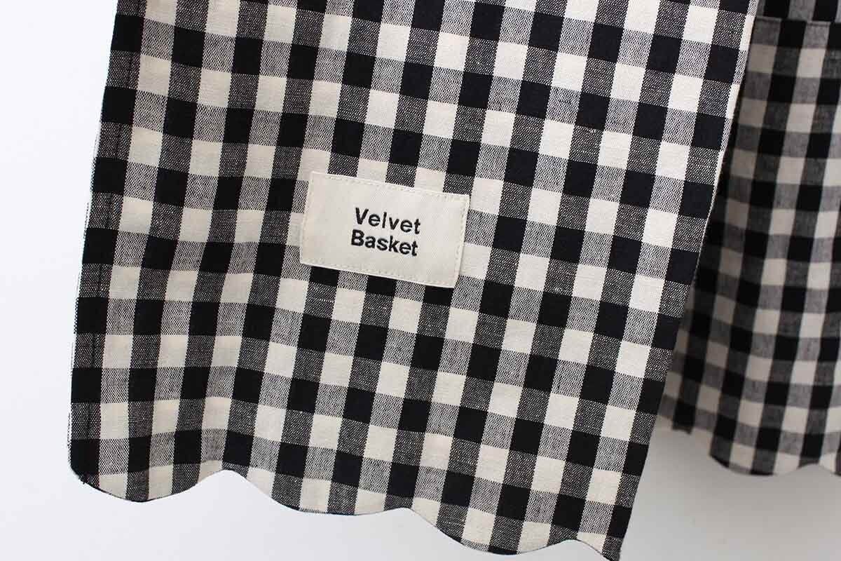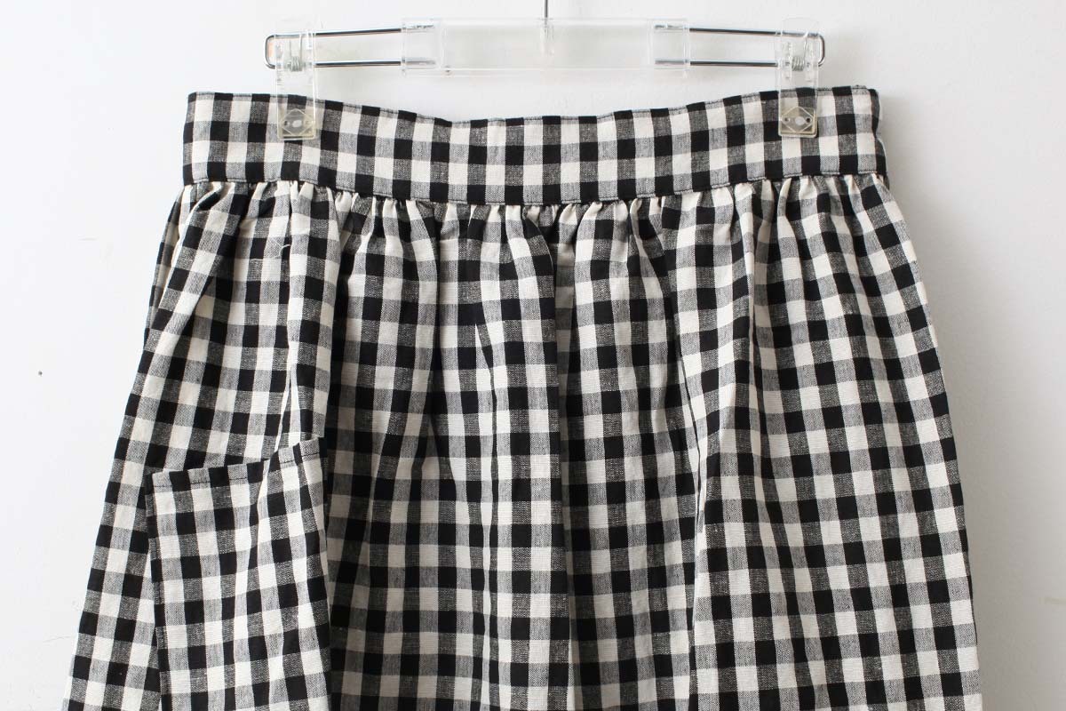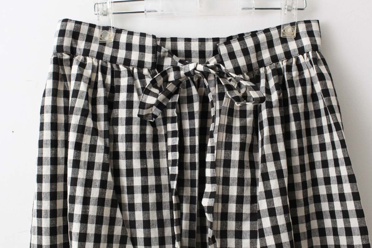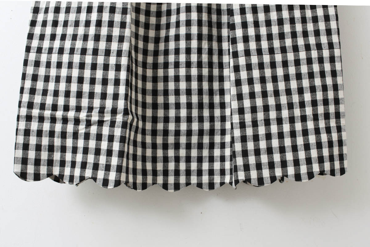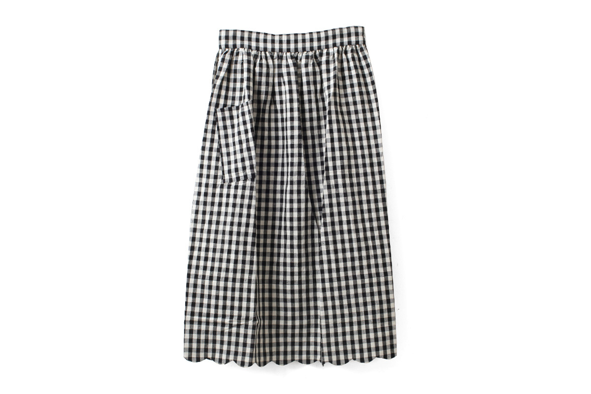 裾のスカラップがポイントのエプロンです。ワンピースに重ねたり、パンツに重ねたり、スカートに重ねたり、着こなし方は様々。意外とコーディネートに馴染むアイテムです。裾からちらりと見えるタグもかわいい。