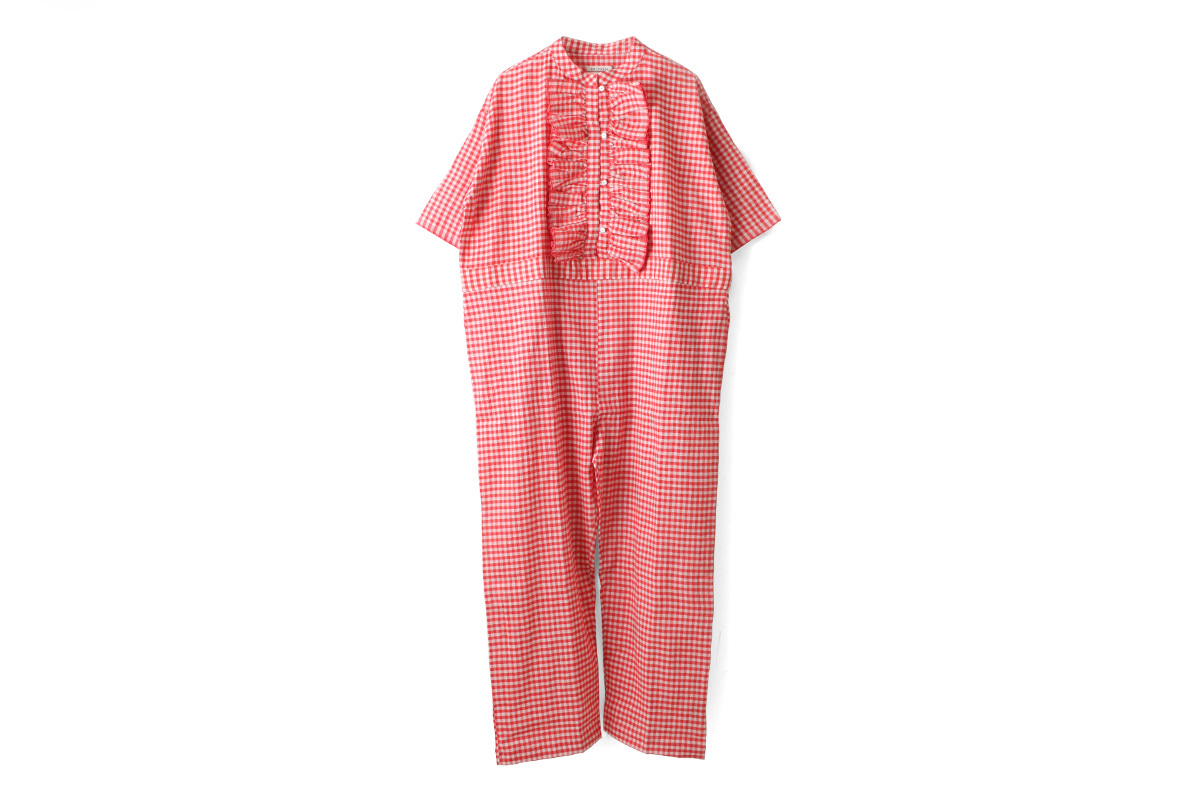 ギンガムチェックとたっぷり施されたフリルがかわいいオールインワン。