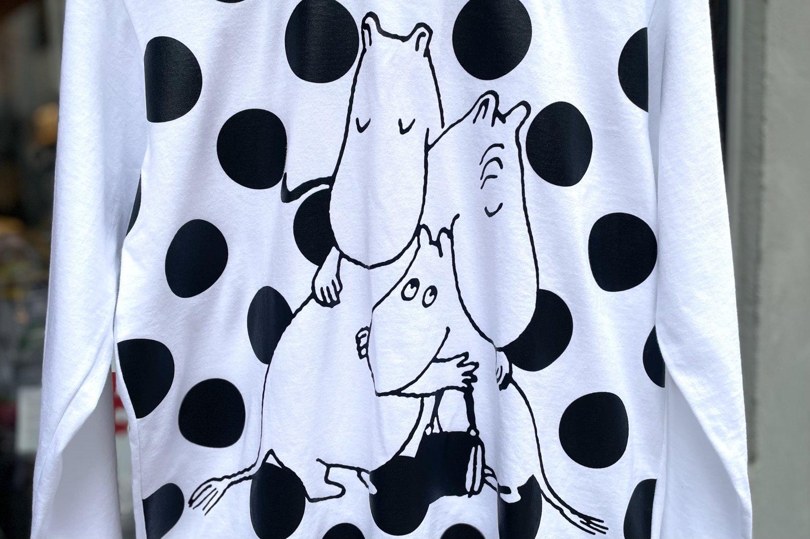 ポルカドットを背景に、ムーミン一家がぎゅっとハグしている心優しいイラスト。透け感なく、地厚な綿素材で気軽に着ていただけるカットソーです。
