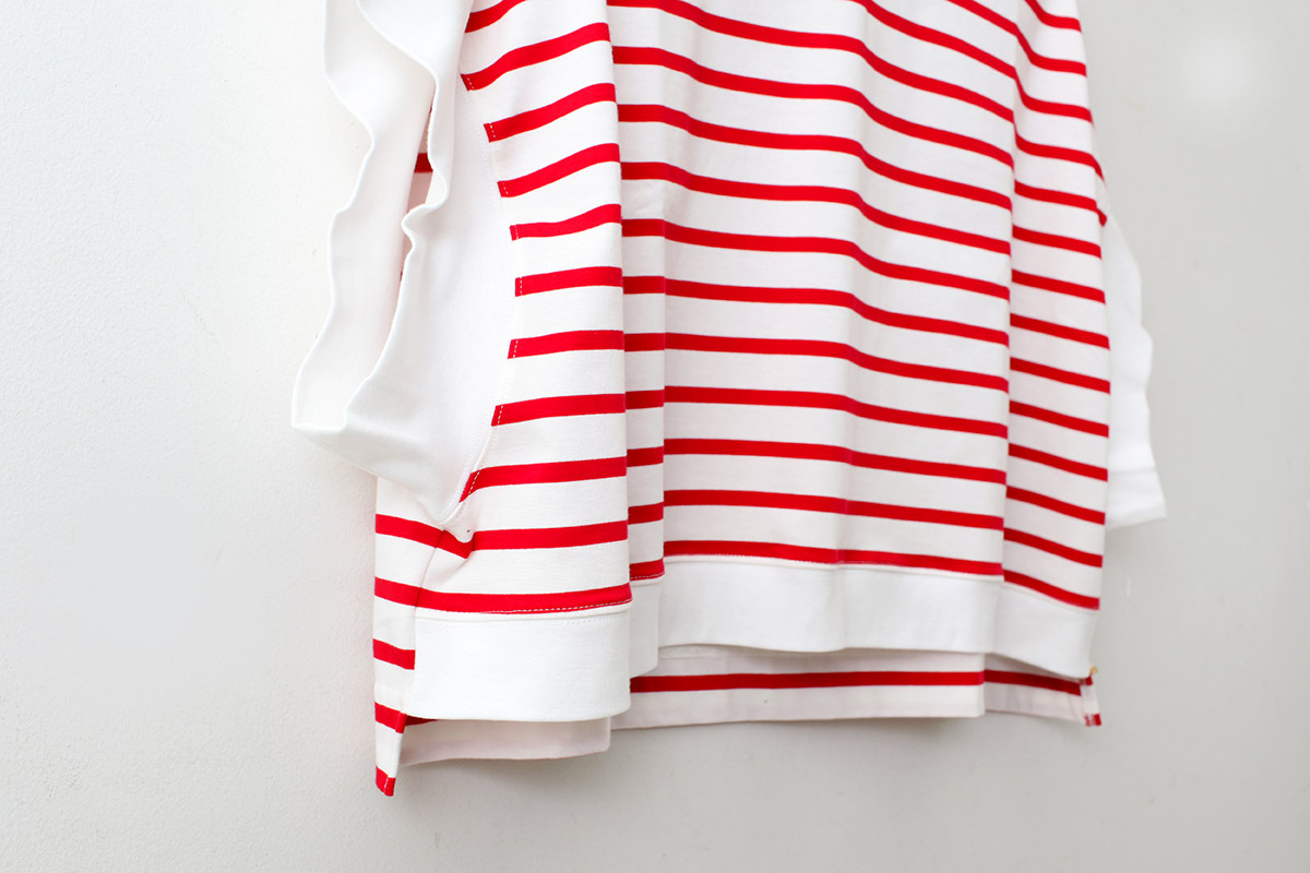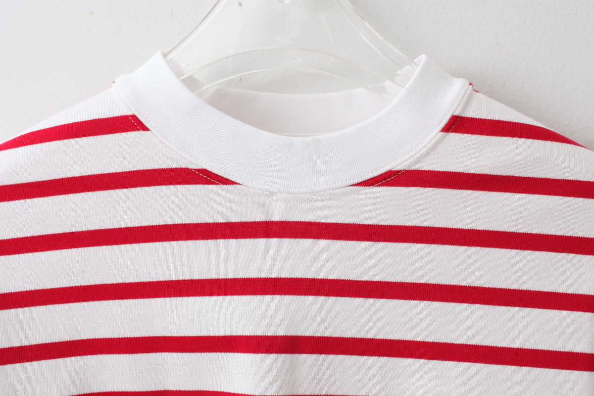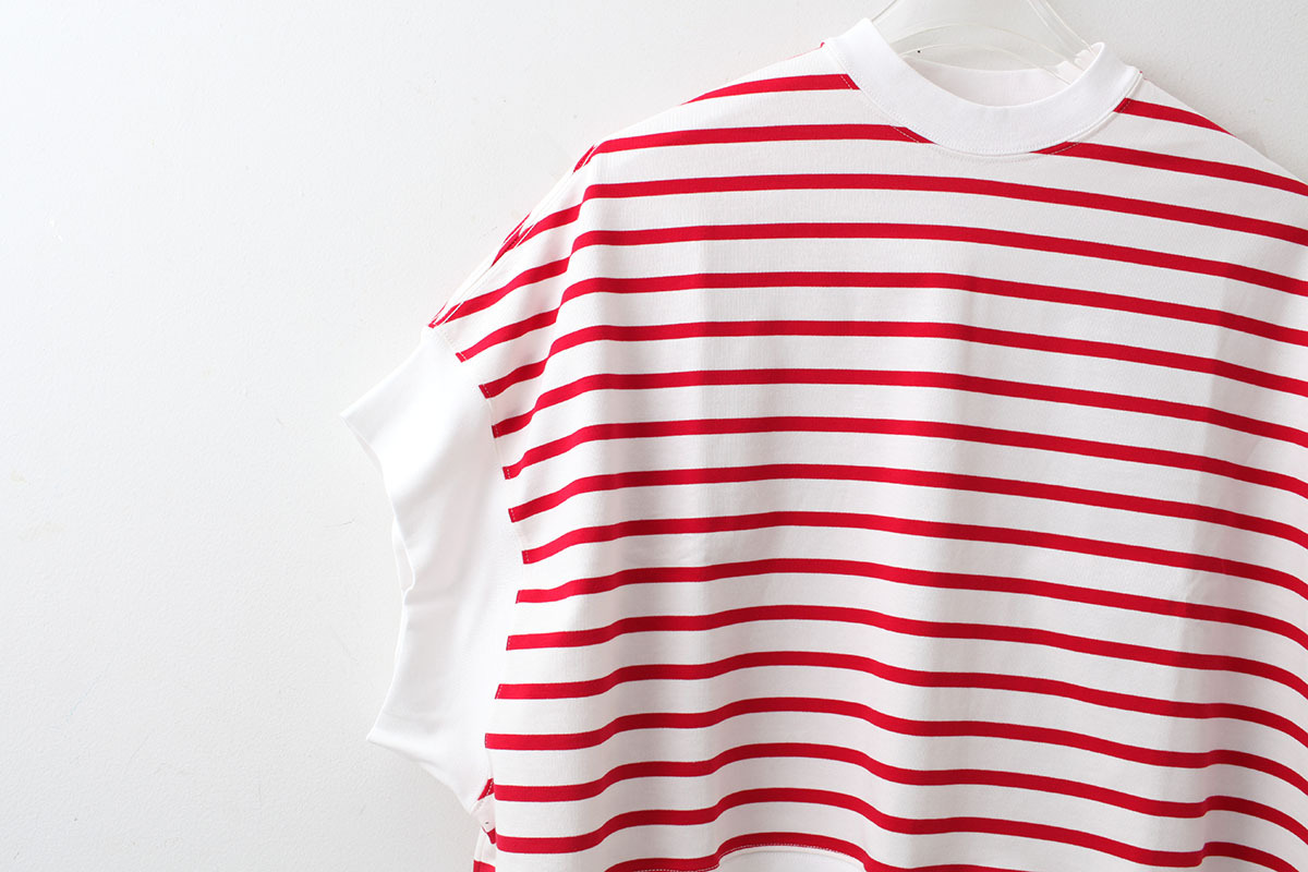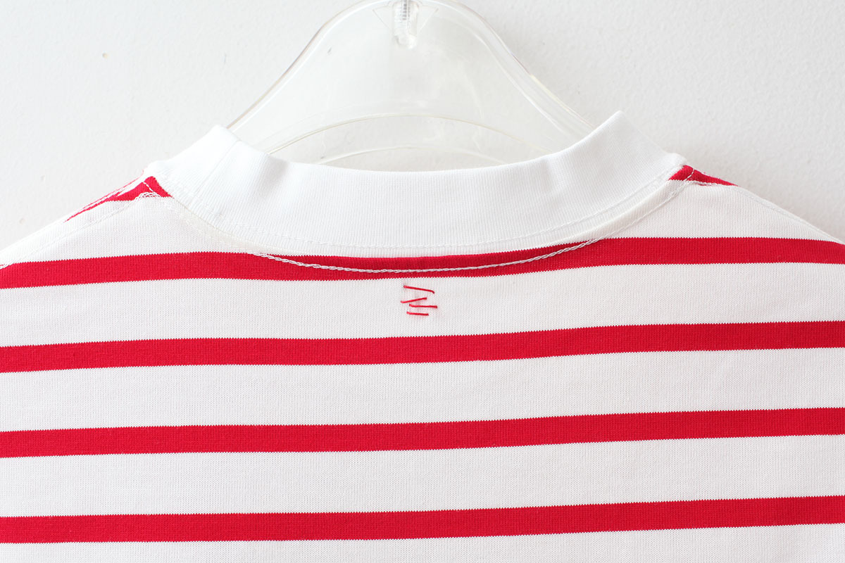 キメが細かく滑らかで毛羽が少なく光沢感があるのが特徴のジャージーで作られた、フレンチスリーブTシャツ。クルーネックの首元はできるだけタイトに仕上げられています。アームホールは大きく開いており、広巾のフライスが合わせてあります。襟がタイトで、袖、裾が緩い動きのあるコットンジャージーのシャツです。左の脇裾にテーマにちなんでのクロワッサンコインがついています。今シーズンは着丈が異なるMとLの2サイズ展開です。