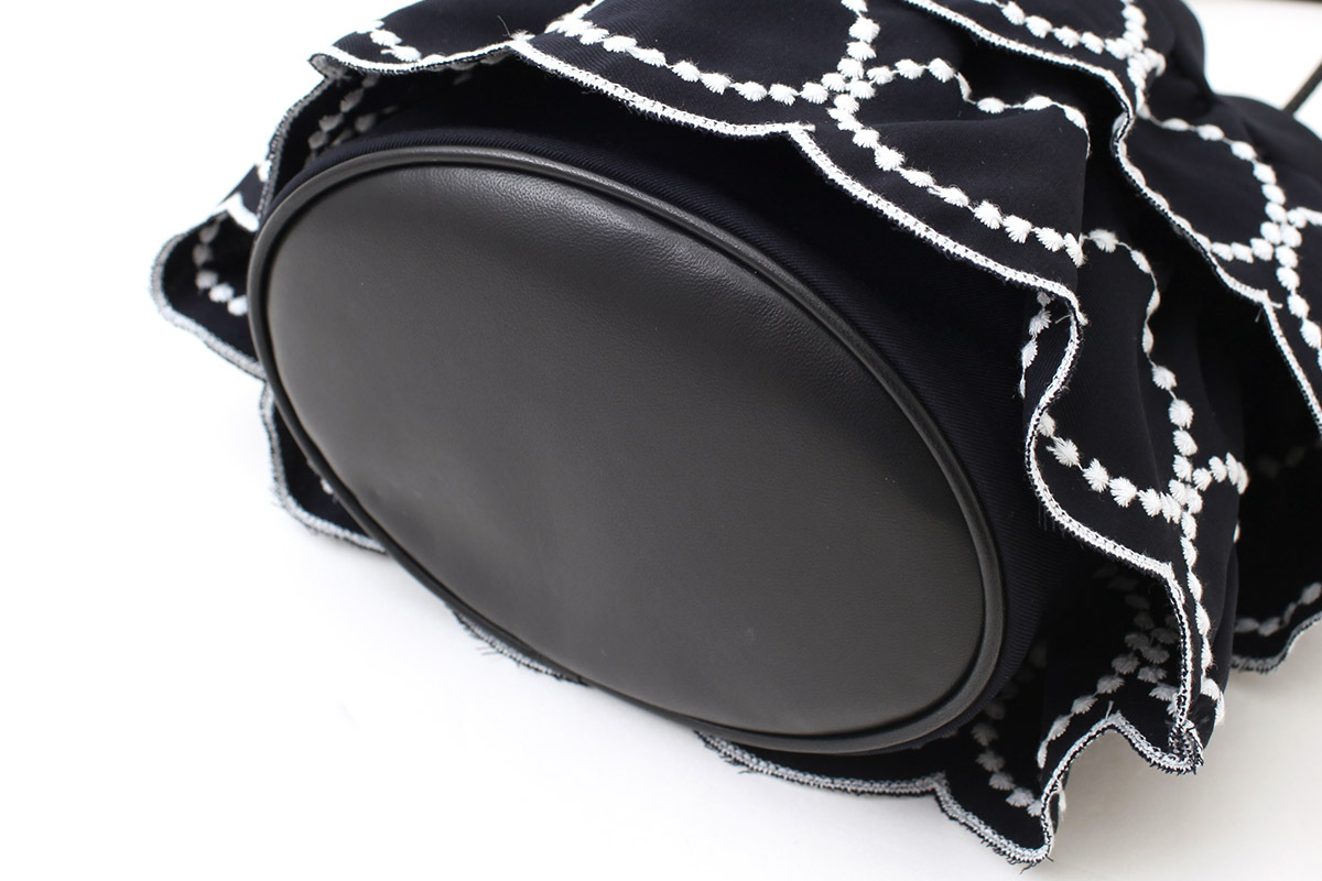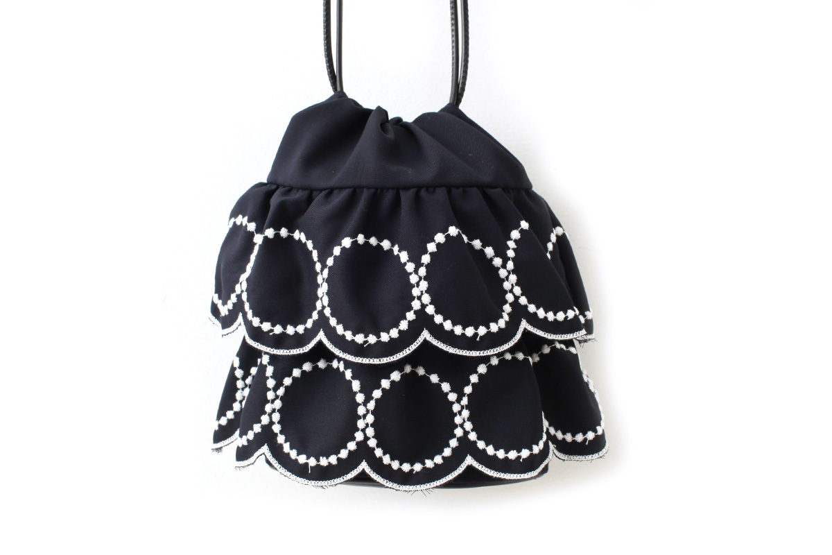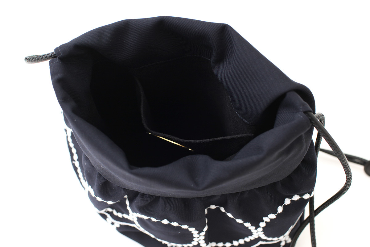 | 商品説明 | くしゅっとした巾着のフォルムがお菓子の「カヌレ」のようなポシェット。テキスタイルをスタイリングのアクセントに添えるようなイメージでお使い頂けます。近くへのお出掛けにはもちろん、小さな身の回りの物をまとめておくポーチのような用途にも。肩にあたる部分や、肩紐、底に使用したレザーがデザインをきりりと引き締めます。 |