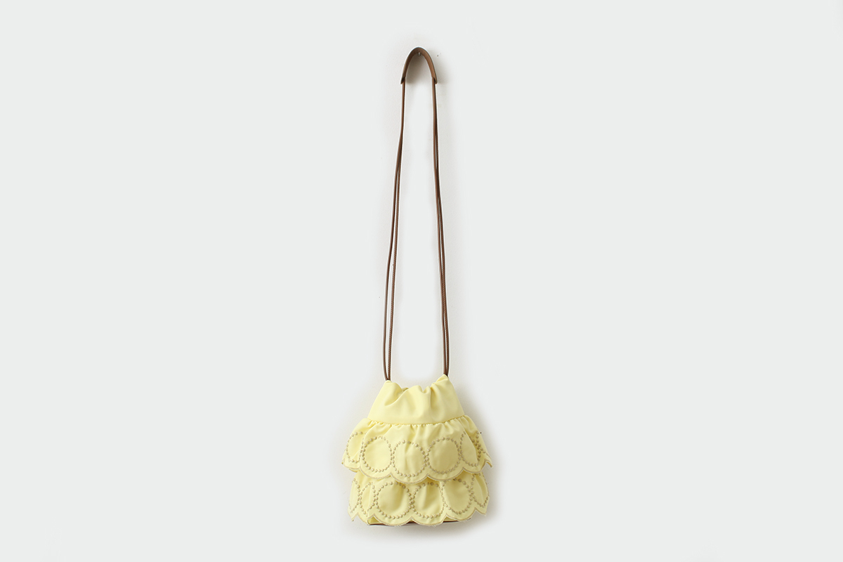 | くしゅっとした巾着のフォルムがお菓子の「カヌレ」のようなポシェット。テキスタイルをスタイリングのアクセントに添えるようなイメージでお使い頂けます。近くへのお出掛けにはもちろん、小さな身の回りの物をまとめておくポーチのような用途にも。肩にあたる部分や、肩紐、底に使用したレザーがデザインをきりりと引き締めます。